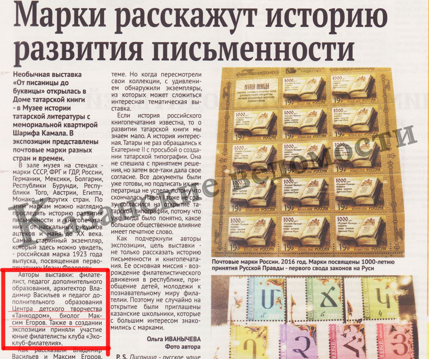 После завершения выставки "От писаницы до буквицы", которая проходила в Музее татарской литературы с 2 февраля по 3 марта вышла статья в газете "Казанские ведомости", посвященная Выставке почтовых марок. Автор выставки педагог дополнительного образования ЦДТ "Танкодром" Егоров М.И. Также в создании экспозиции приняли участие юные филателисты объединения "Экоклуб - филателия" ЦДТ "Танкодром".