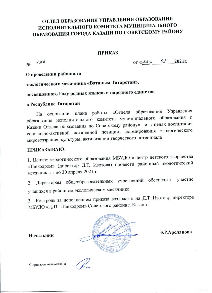 Отдела образования Управления образования Исполнительного комитета муниципального образования города Казани по Советскому району от 25.03.2021 № 196 "О проведении районного экологического месячника "Ватаным Татарстан", посвященного Году родных языков и народного единства в Республике Татарстан2. ПОЛОЖЕНИЕ о месячнике "Ватаным Татарстан"