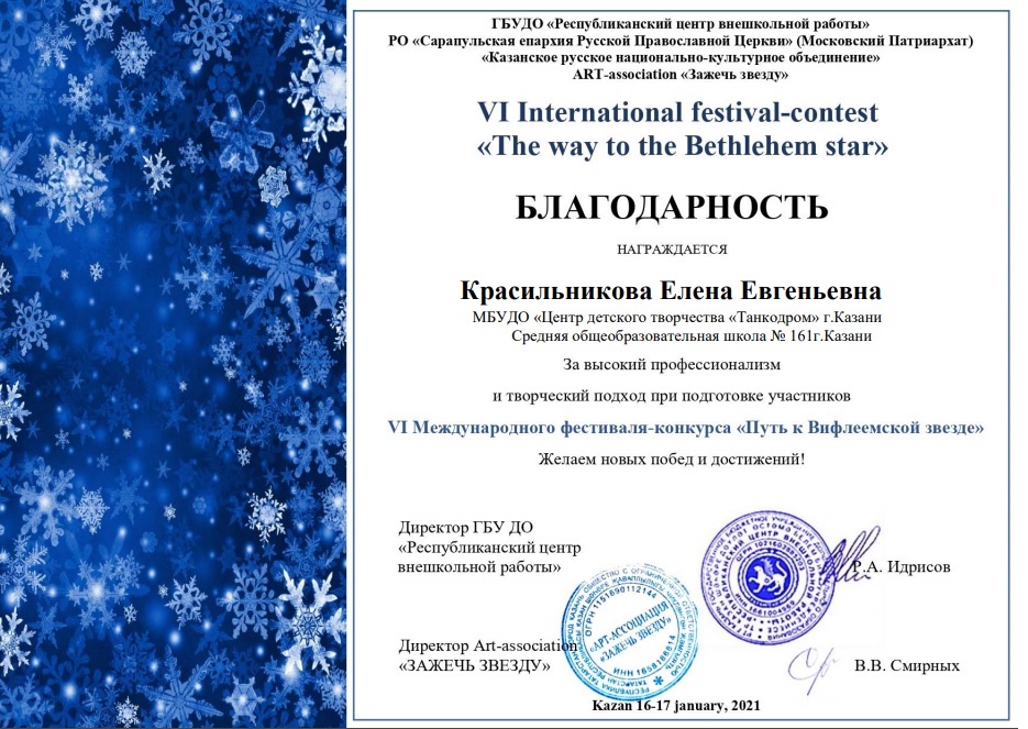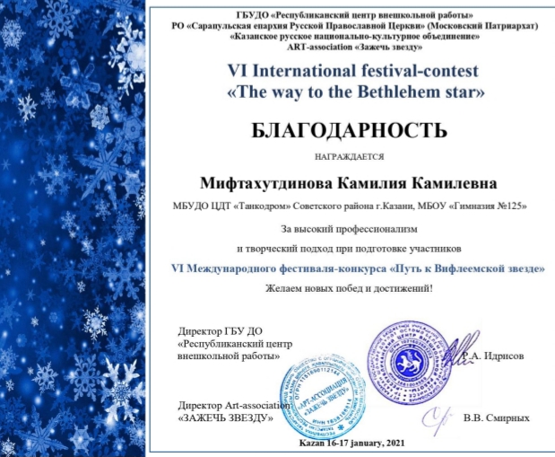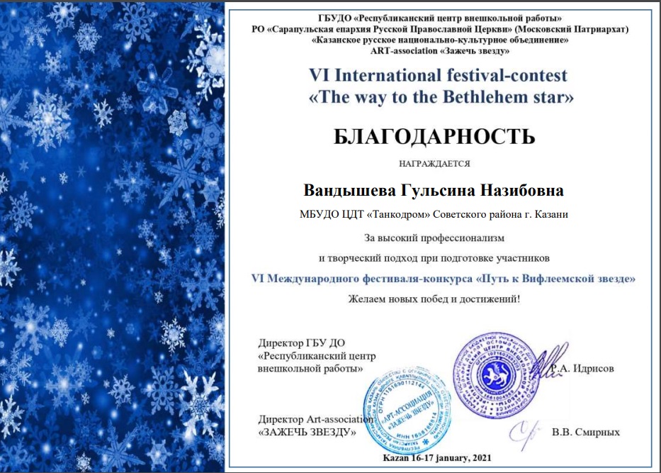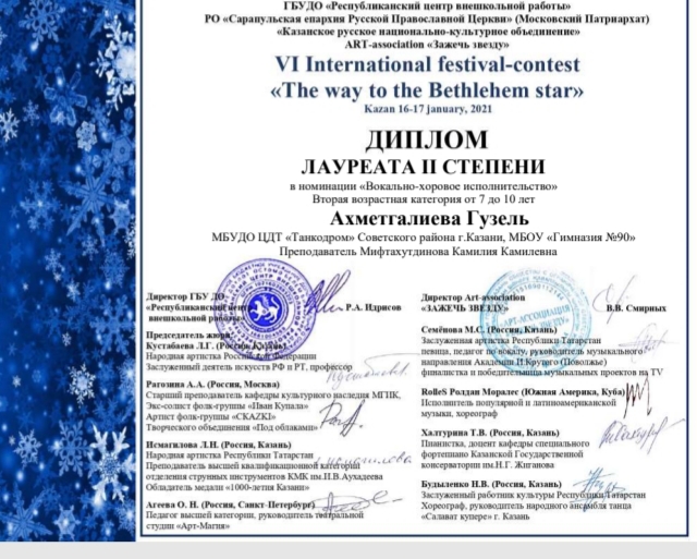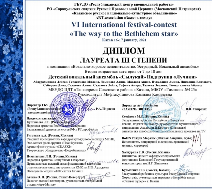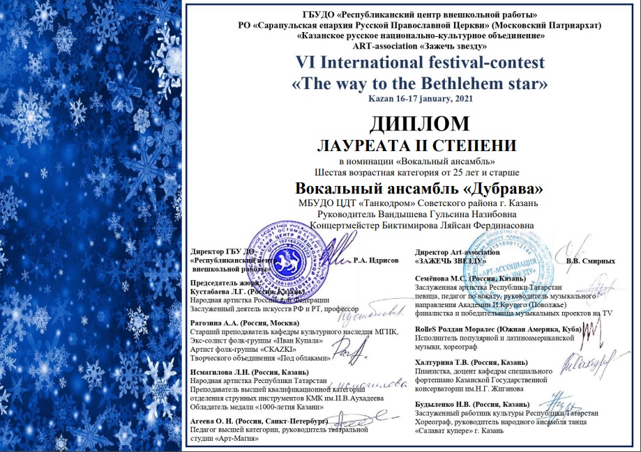 Вокальный ансамбль "Дубрава" ЦДТ "Танкодром", руководитель Вандышева Гульсина Назибовна, принял учавстие в VI Международном фестивале- конкурсе «Путь к Вифлеемской звезде».