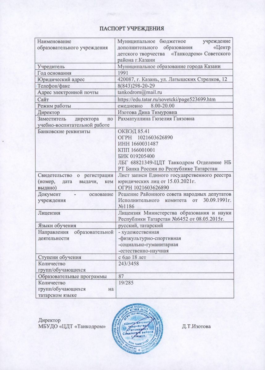 Муниципальное бюджетное учреждение дополнительного образования "Центр детского творчества "Танкодром" Советского района г. Казани