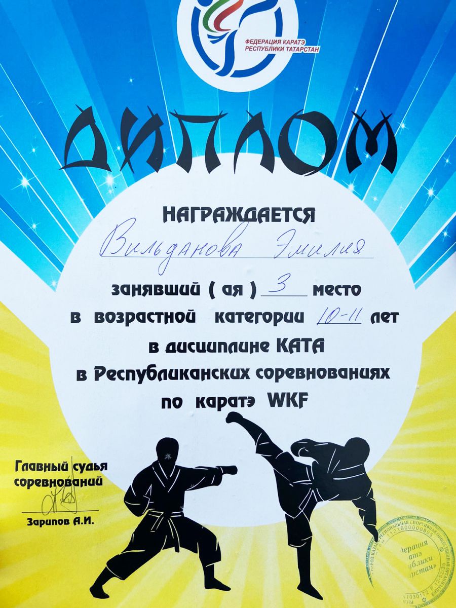 Опубликовано: 15.02.2022Поздравляем победителя Республиканских соревнований по каратэ! Вильданова Эмилия получила 3 место в дисциплине КАТА. Преподаватель Осипова Людмила Алексеевна.