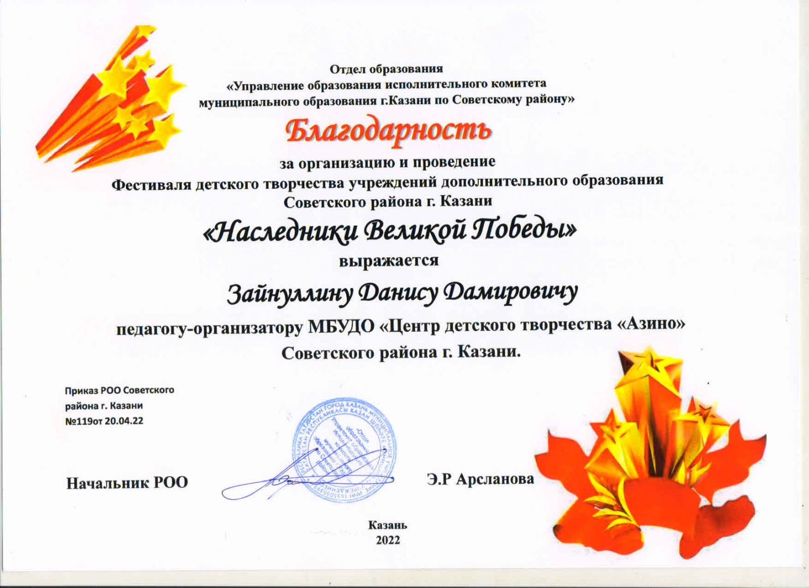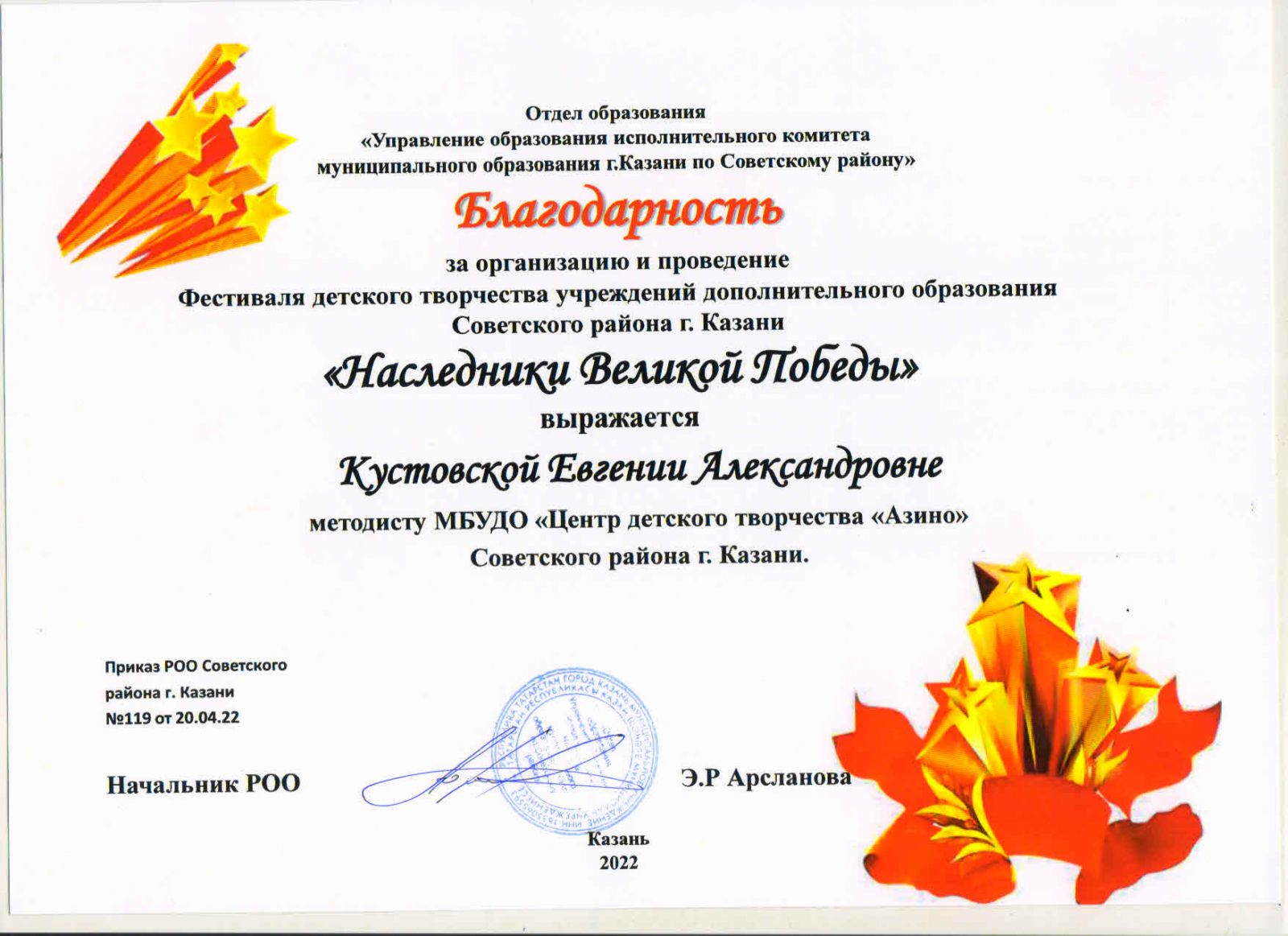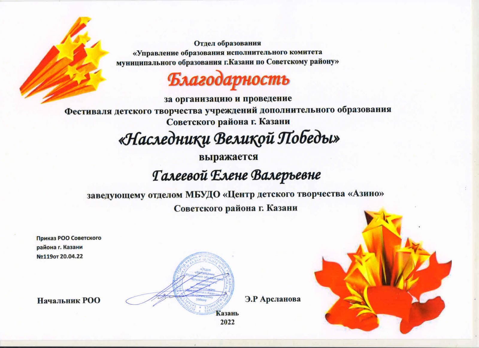 Директору ЦДТ "Азино" Сунгатуллиной Ф.Г было вручено Благодарственное письмо за помощь в реализации проектов и неоценимый вклад в развитие "Российского движения школьников" Республики Татарстан .