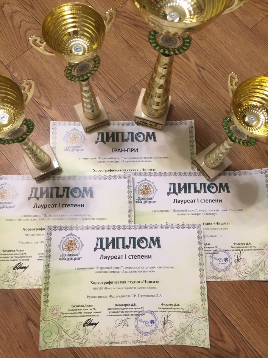 20 марта хореографическая студия «Чишмэ» приняла участие во Всероссийском фестивале конкурсе «Добрые традиции». Ребята завоевали три кубка лауреатов 1 степени и кубок Гран-при!