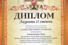10 декабря в КГУКИ состоялся VIII Всероссийский конкурс музыкального исполнительства «СОЗВЕЗДИЕ ЮНЫХ ТАЛАНТОВ». Стальмахова Анна (пр.Марина Т.А.) - Лауреат II степени, Спиридонова Дарья (пр.Абдуллин Б.Р.) -Дипломант I степени. Кирюхин Сергей (пр.Марина Т.А.) - Лауреат II степени, Поздравляем!!!