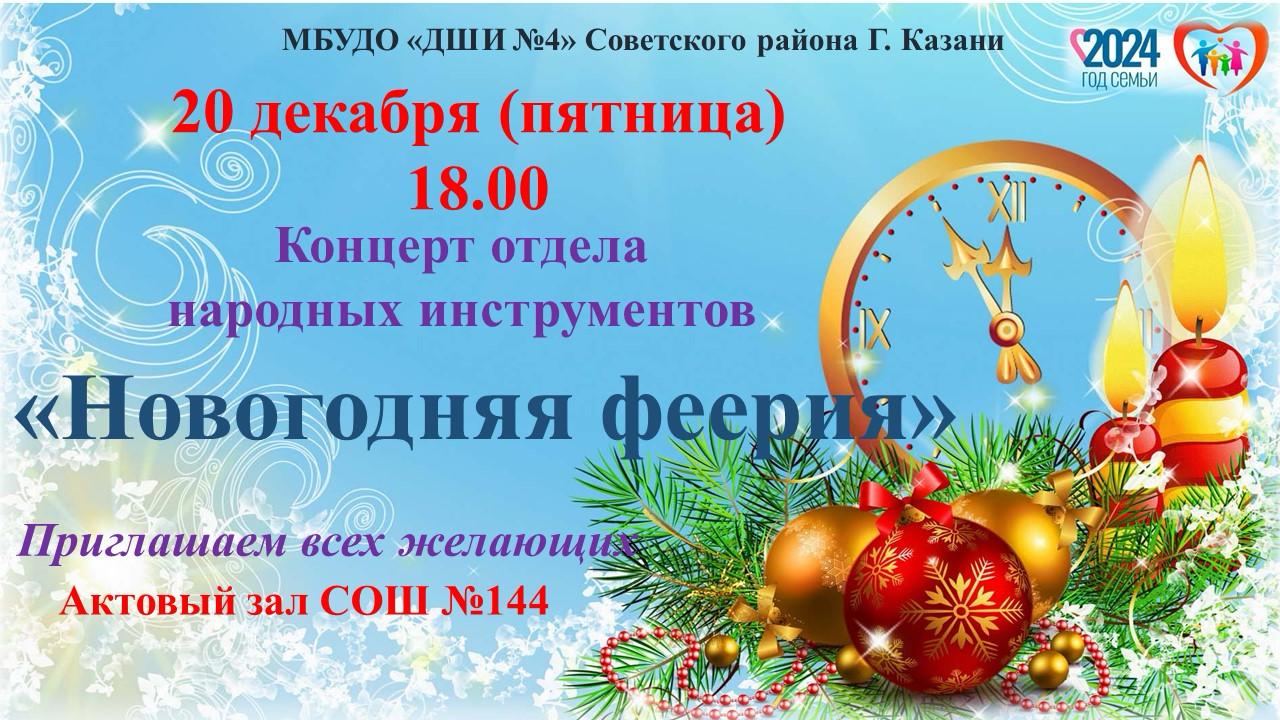 20 декабря в актовом зале СОШ №144 состоялся концерт отдела народных инструментов «Новогодняя феерия». В концертной программе приняли участие оркестр народных инструментов (рук. Марин А.В., Марина Т.А.) а также солисты (баян, аккордеон) и семейные ансамбли Булатовых, Сиразовых и Багавиевых. Концерт был посвящен году семьи, прошел в теплой домашней обстановке. Зрители получили огромное удовольствие, улыбки и массу положительных эмоций!