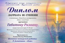 Габитов Ризван (преп. Галиев И.Ф.) – Лауреат 3 степени Международного конкурса инструментального исполнительства «Музыкальный рассвет». Поздравляем!