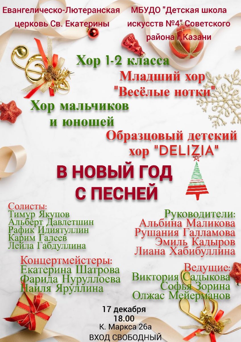 17 декабря состоялся концерт хорового отделения в Евангелическо-Лютеранской церкви Св. Екатерины. Хор 1 класса, хор мальчиков и юношей, хор «Весёлые нотки», образцовый хор «Delizia» исполнили яркие произведения разных жанров, стилей, а также на разных языках. Выступали не только хоровые коллективы, но и солисты - Карим Галиев, Давлетшин Альберт, Тимур Якупов, Рафик Идиятуллин. Все зрители были восхищены таким ярким концертом! А создали такой новогодний праздник преподаватели хорового отделения - Маликова А.Я., Хабибуллина Л. И., Кадыров Э. А., Галламова Р. Р., концертмейстеры Шатрова Е. Е., Нуруллоева Ф. С., Яруллина Н. Р.