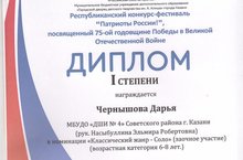 10 ноября в ГДДТ им. А. Алиша прошел Республиканский конкурс-фестиваль «Патриоты России!», посвященный 75 –ой годовщине Победы в Великой Отечественной войне. Чернышова Дарья ( пр.Насыбуллина Э.Р.) – Лауреат 1 степени. Поздравляем!!