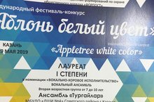 19 мая прошел Международный фестиваль-конкурс "Яблонь белый цвет", в котором успешно выступили учащиеся воального отделения : Вокальный ансамбль "Тургайлар" (рук.Ягуфарова Р.Г., Садыкова В.М.) - Лауреат 3 степени, Стулова Мария(пр.Садыкова )- Лауреат 3 степени, Данилова Настя(пр.Садыкова В.М.) - Лауреат 2 степени, Каримова Самира - Лауреат 3 степени. Поздравляем!!!