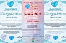 Воспитанник класса скрипки Сираевой Люции Вазыховны Полянный Заур удостоен звания Лауреата 3 степени Международного конкурса детского и юношеского творчества «ХРУСТАЛЬНОЕ СЕРДЦЕ МИРА»! Также Люция Вазыховна и концертмейстер Закирова Мадина Ахатовна награждены благодарственным письмом организаторов конкурса. Конкурс организован при поддержке Управления Культуры Ростовской области.