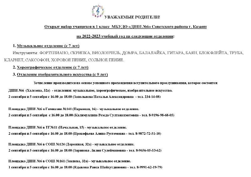 Площадка ДШИ №6 в СОШ №161 (Закиева, 32а) - 1 сентября и 5 сентября с 16.00 до 18.00 (Ядыкова Раиса Шайхутдиновна - тел. 8-9991-62-19-79)
