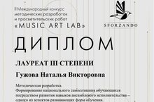 Гужова Наталья Викторовна, преподаватель по классу баяна ДШИ № 6, стала лауреатом III cтепени III Международного конкурс методических разработок и просветительских работ «MUSIC ART LAB», организованный Региональным благотворительным общественным фондом развития музыкального исполнительства Республики Татарстан «SFORZANDO» с работой на тему формирования национального самосознания на уроках ансамбля. Поздравляем Наталью Викторовну с закреплением многолетней работы с национальным ансамблем в методическом аспекте!
