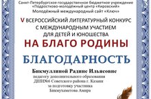 В Санкт-Петербурге завершился литературный конкурс, основным направлением которого стало создание сборника лучших детских и юношеских работ, посвящённых родному краю: истории, героям, природе, близким людям. Бикмуллина Радина Ильясовна удостоена благодарственного письма Всероссийского литературного конкурса с международным участием "На благо Родины" - 2020-2021, организованного Союзом Писателей России,Санкт–Петербургским государственным бюджетным учреждением «ПМЦ «Кировский», в котором участвовал ее ученик Бикмухаметов Амир.