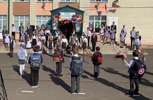 На фото: обучающиеся ДШИ № 6 (филиал "Нагорный") солнечным утром 1 сентября выступает на линейке (дистанцию соблюдаем). -