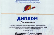 Учащийся нашей школы Валиев Салават (рук. Занозовский И.А.) принял участие во Всероссийском конкурсе молодых исполнителей на народных инструментах TUTTI .FOLK, который проходил в г. Набережные Челны. По итогам конкурса получил диплом Дипломанта в номинации "Баян. Аккордеон". Поздравляем! Желаем дальнейших творческих успехов!