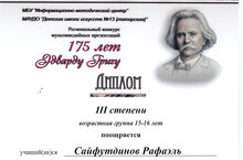 Учащийся нашей школы Сайфутдинов Рафаэль (рук. Усенкова Е.С.) принял участие в Региональном конкурсе мультимедийных презентаций "175 лет Эдварду Григу". По итогам конкурса был награжден дипломом 3 степени. Поздравляем! Желаем дальнейших творческих успехов!