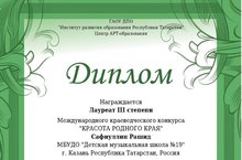 Учащийся нашей школы Сафиуллин Рашид (рук. Гудошникова М.А.) принял участие в Международном краеведческом конкурсе "Красота родного края". По итогам конкурса получил диплом лауреата 3 степени. Поздравляем! Желаем дальнейших творческих успехов!