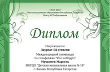 Учащиеся нашей школы приняли участие в Международной олимпиаде по сольфеджио Vivo Solfeggio. По итогам олимпиады Мухамеев Марсель (рук. УсенковаЕ.С.) получил диплом Лауреата 3 степени. Поздравляем! Желаем дальнейших творческих успехов.