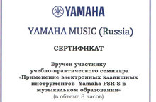 7 апреля педагоги школы приняли участие в 8-часовом учебно-практическом семинаре "Применение электронных клавишных инструментов Yamaha PSR-S в музыкальном образовании". По итогам участия каждый получил "Сертификат участника"