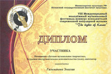 Учащаяся нашей школы Гильманова Эмилия (педагог Салихова А.Х.) приняла участие в Международном молодёжном музыкальном фестивале-конкурсе исполнителей современной популярной музыки The Lights of Kazan. По итогам конкурса получила диплом. Поздравляем! Желаем дальнейших творческих успехов!