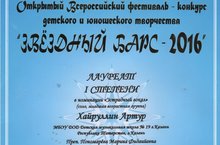 Учащиеся нашей школы приняли участие в Открытом Всероссийском фестивале-конкурсе детского и юношеского творчества "Звёздный Барс- 2016". По итогам конкурса Хайруллин Артур получил Диплом лауреата 1 степени (педагог Пономарёва М.Ф.). Поздравляем! Желаем дальнейших творческих успехов!