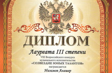 Диплом лауреата 3 степени - Сабиров Мирсаид (педагог Коринец Ж.В.)