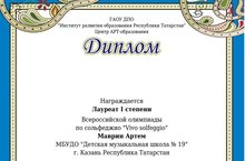 Учащиеся нашей школы приняли участие во Всероссийской олимпиаде по сольфеджио Vivo solfeggio. По итогам олимпиады Маврин Артем (педагог Усенкова Е.С.) получил диплом лауреата 1 степени. Поздравляем! Желаем дальнейших творческих успехов!