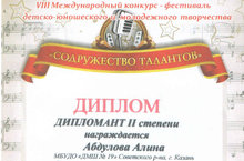 Учащиеся нашей школы приняли участие в Международном конкурс-фестивале детско-юношеского и молодежного творчества "Содружество талантов". По итогам конкурса Абдулова Алина получила диплом "Дипломант 2 степени" (педагог Маклашова Е.А.). Поздравляем с победой! Желаем дальнейших творческих успехов!