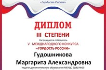 Педагог нашей школы Гудошникова Маргарита Александровна принимала участие в Международном конкурсе "Гордость России". На конкурс была представлена работа: "Игровые технологии в развитии музыкально-творческих способностей детей". По итогам конкурса получила диплом 3 степени в номинации "Педагогический опыт". Поздравляем! Желаем дальнейших творческих успехов!