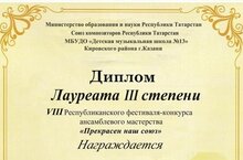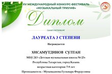 Поздравляем Хисамутдинова Султана (преподаватель: Мухамадиева Гульнара Фирдусовна) - Лауреата 3 степени XV Международного конкурса- фестиваля "Музыкальный триумф"! Желаем дальнейших творческих успехов и новых побед!
