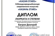 Поздравляем Багрова Дмитрия (преподаватель: Хазиева Раиса Гумаровна) - Лауреата II степени IV Международного конкурса современного искусства «КАЗАНЬ STARS»! Желаем дальнейших творческих успехов и новых побед!
