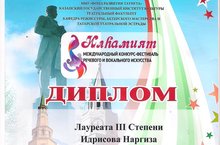 Поздравляем лауреата III степени Международного конкурса-фестиваля речевого и вокального искусства "Илhамият" - Идрисову Н. и преподавателя Фазлиахметову Г.Д. Желаем дальнейших творческих успехов!