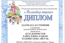 Лауреат II степени - дуэт домристов: Хайруллина Р., Худойкулова А., преподаватель: Аксакова-Хусаенова А.В., концертмейстер: Шириева Э.Р.