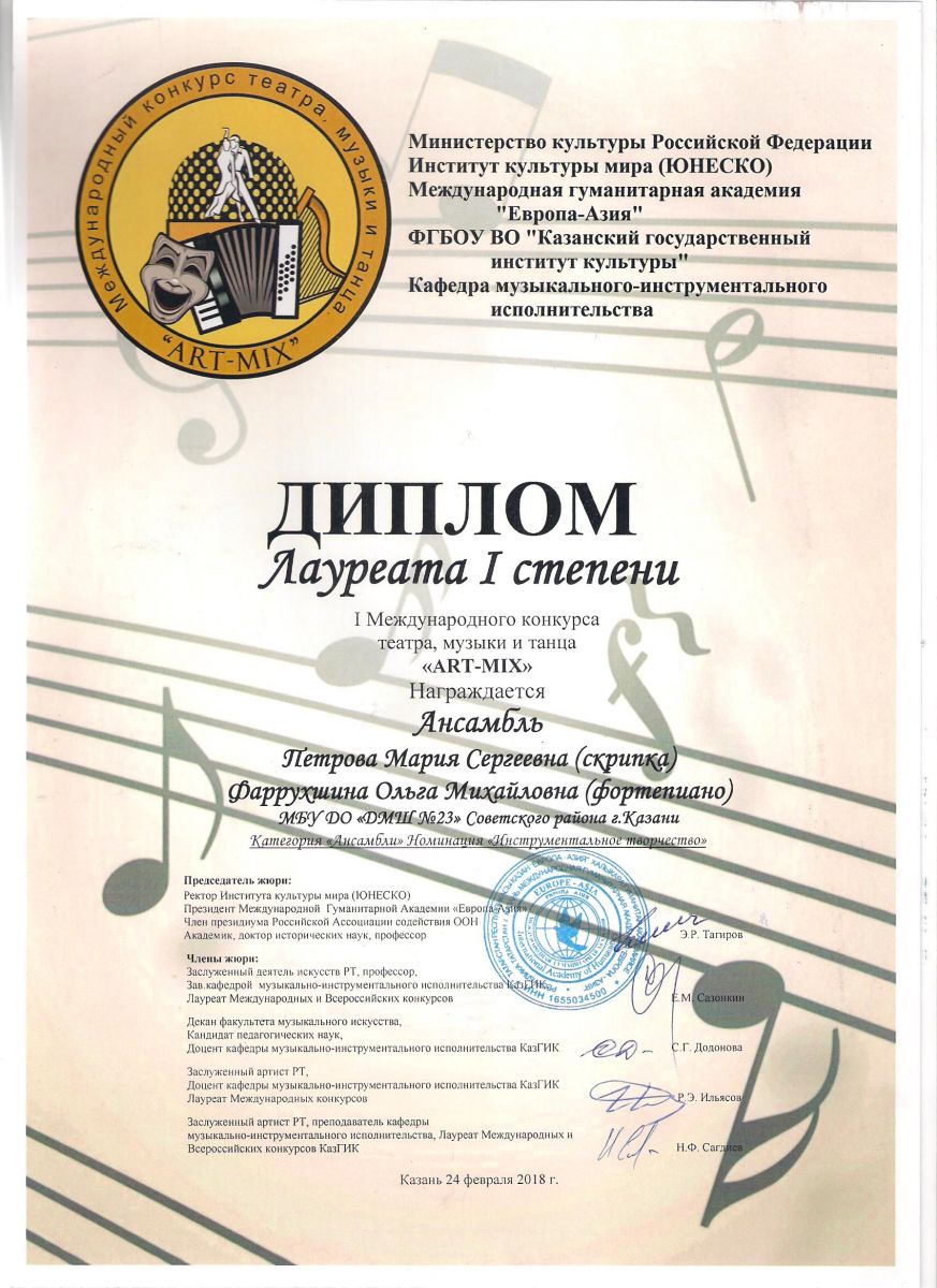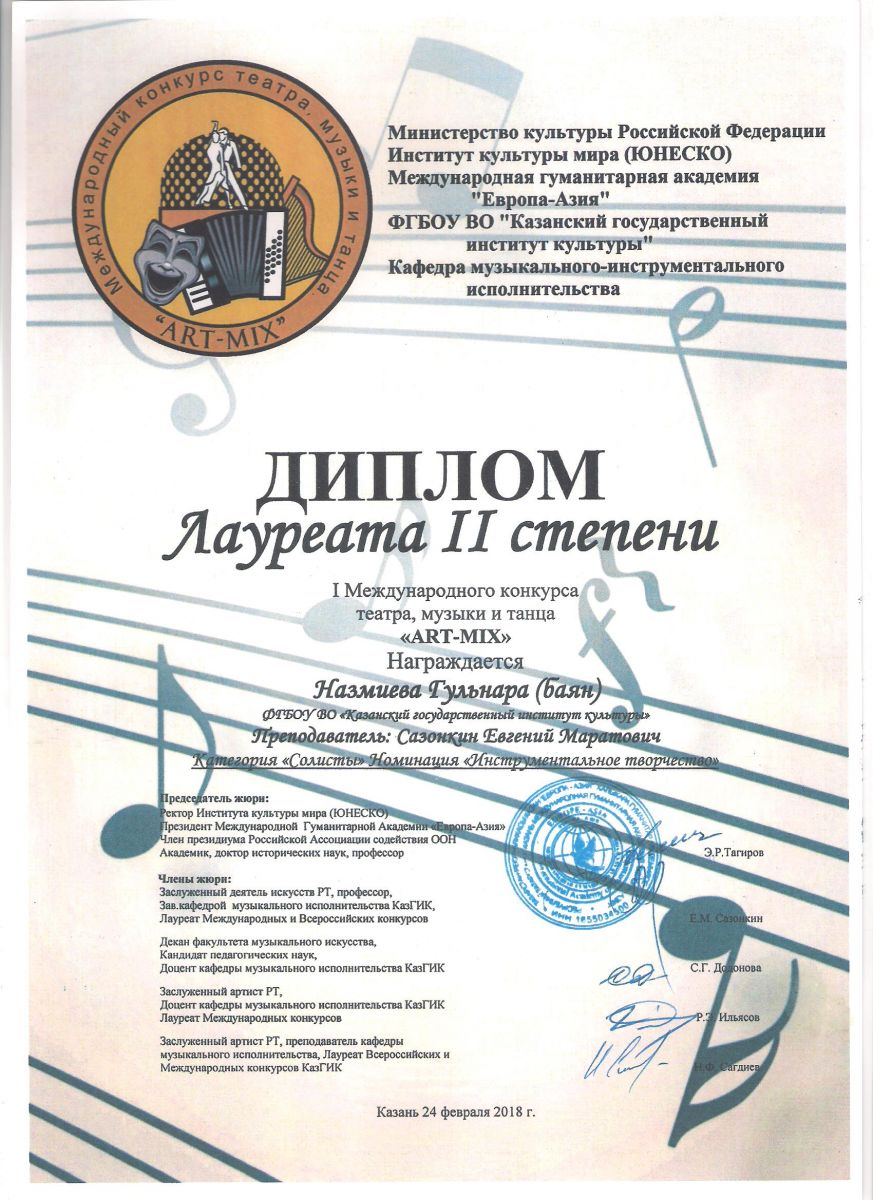 I Международный конкурс театра, музыки и танца "ART-MIX" - Диплом лауреата 2 степени - Назмиева Г.Ф.