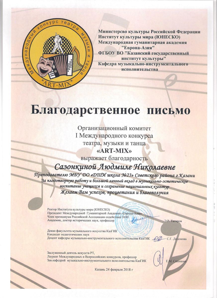 I Международный конкурс театра, музыки и танца "ART-MIX" - Благодарственное письмо - Сазонкина Л.Н.