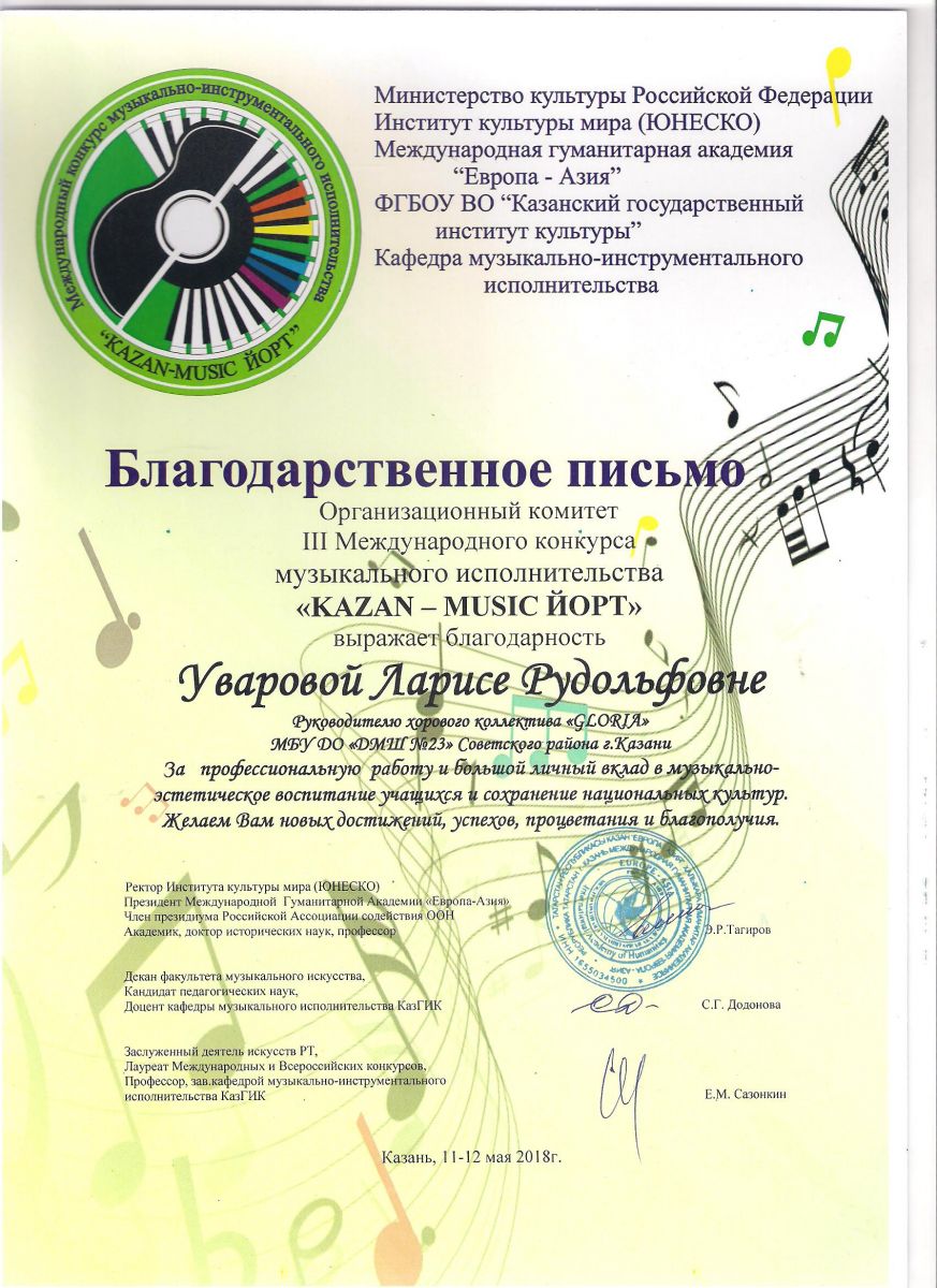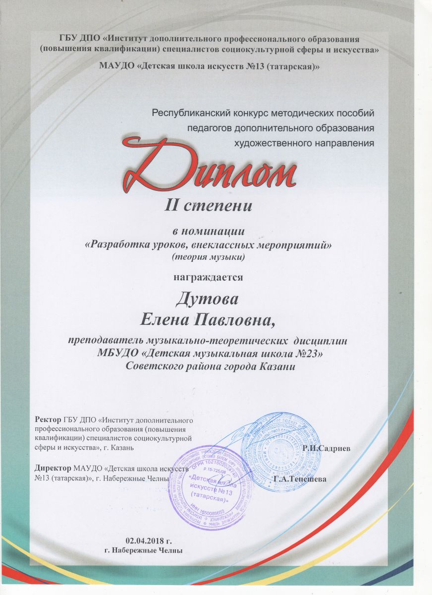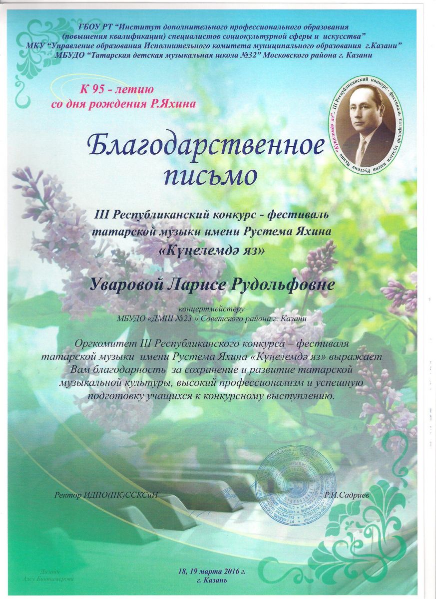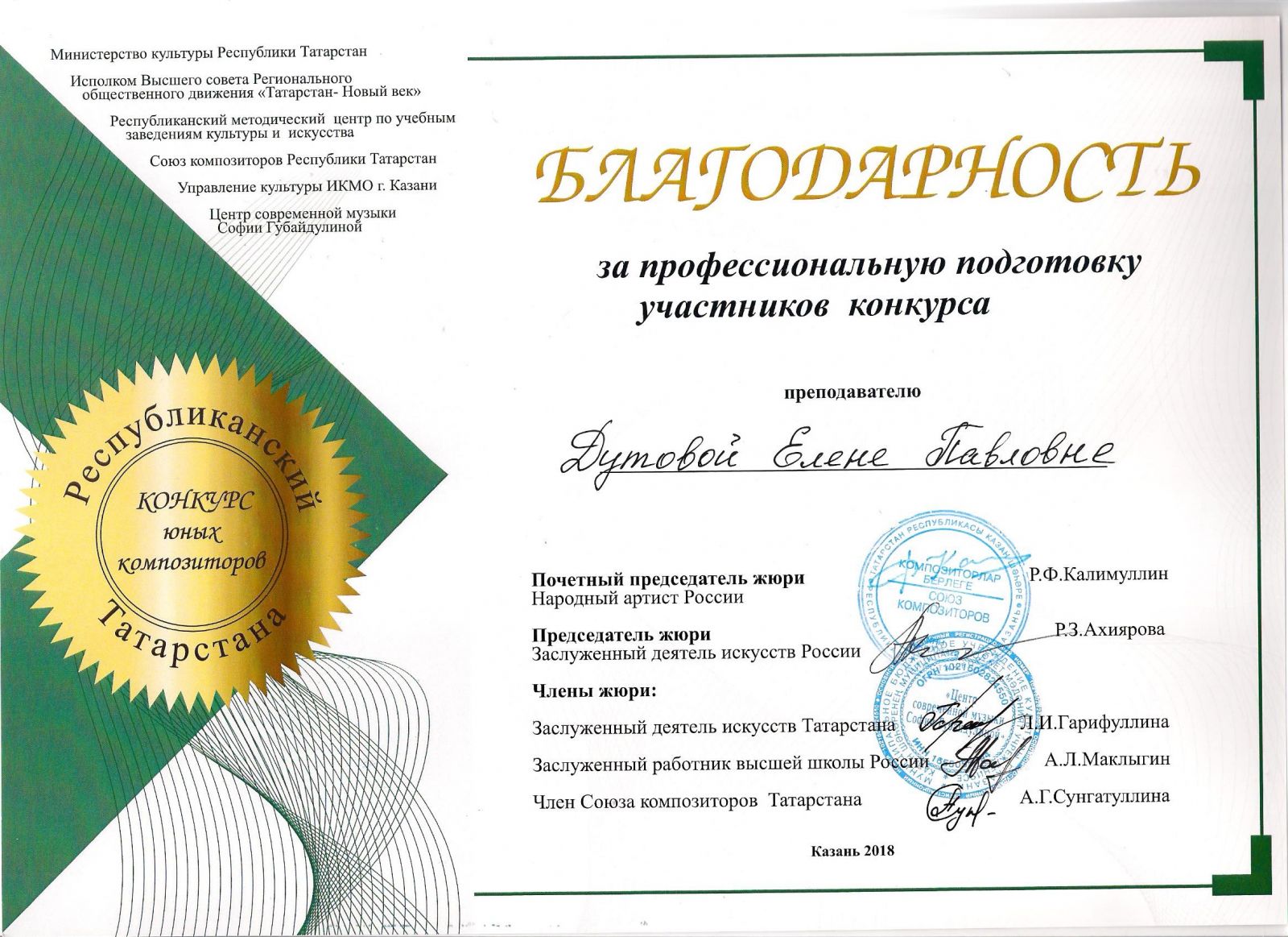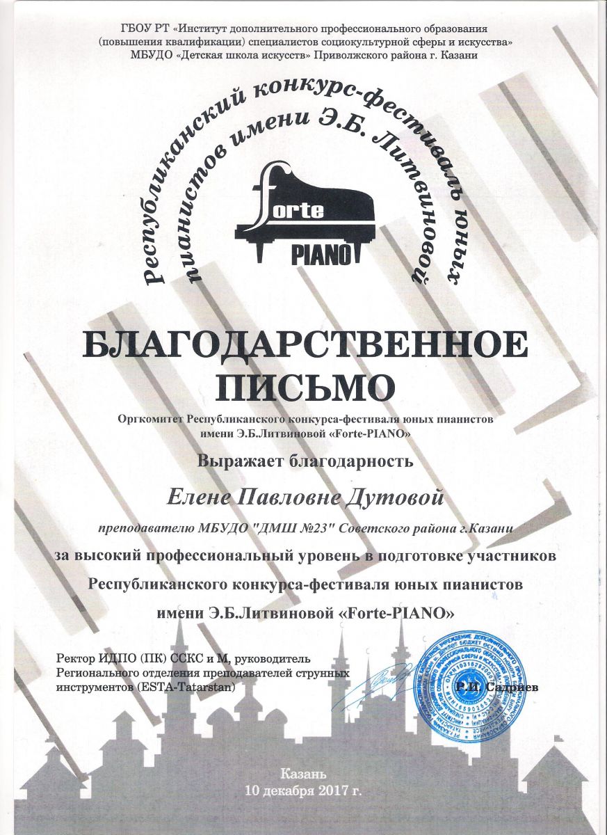 Республиканский конкурс юных композиторов Татарстана - Благодарность - Дутова Е.П.