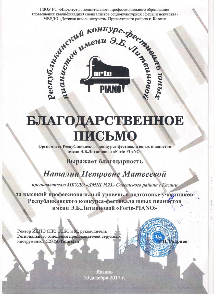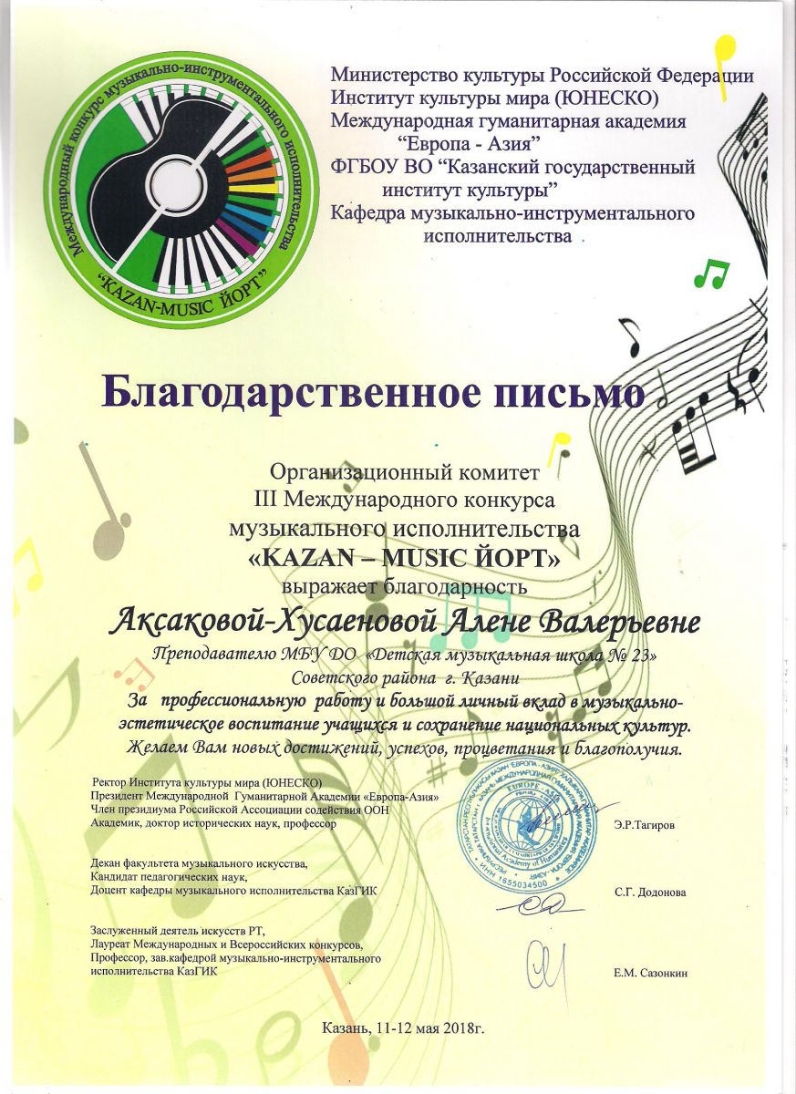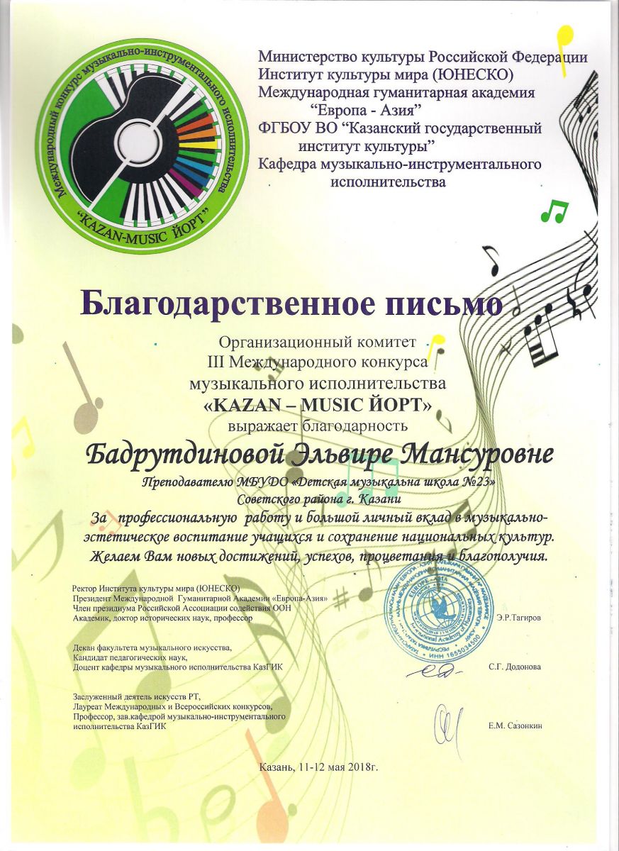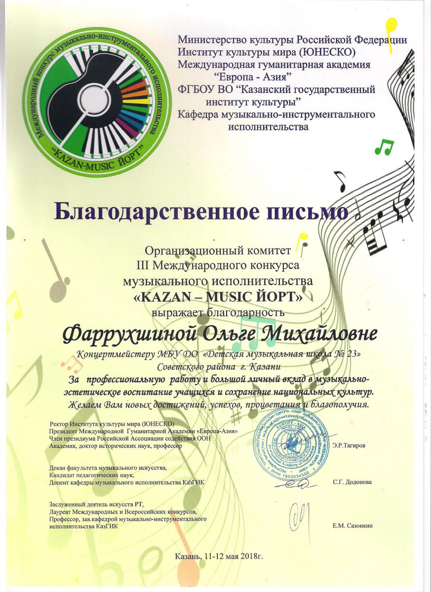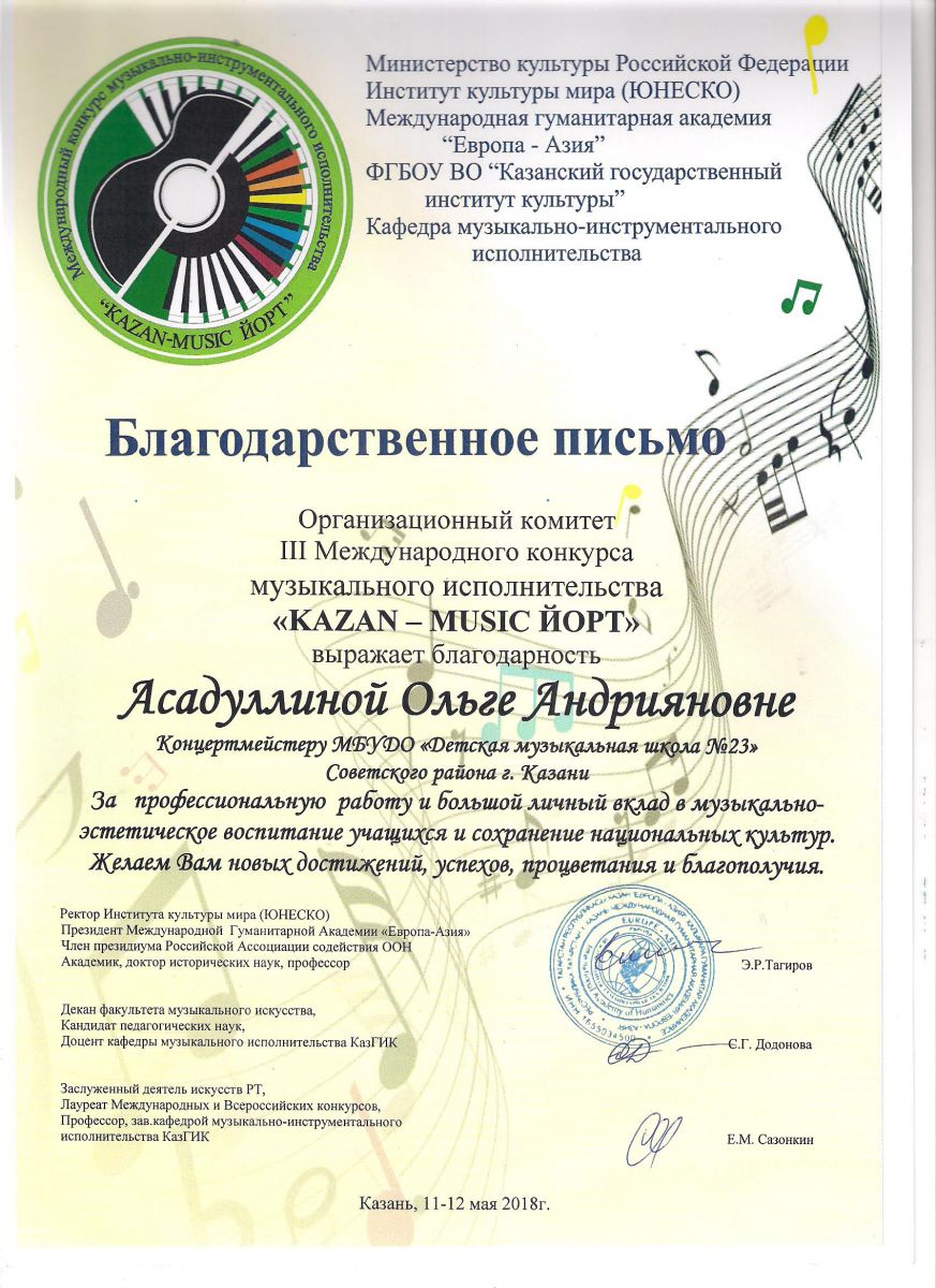 Республиканский конкурс юных композиторов Татарстана - Благодарность - Дутова Е.П.