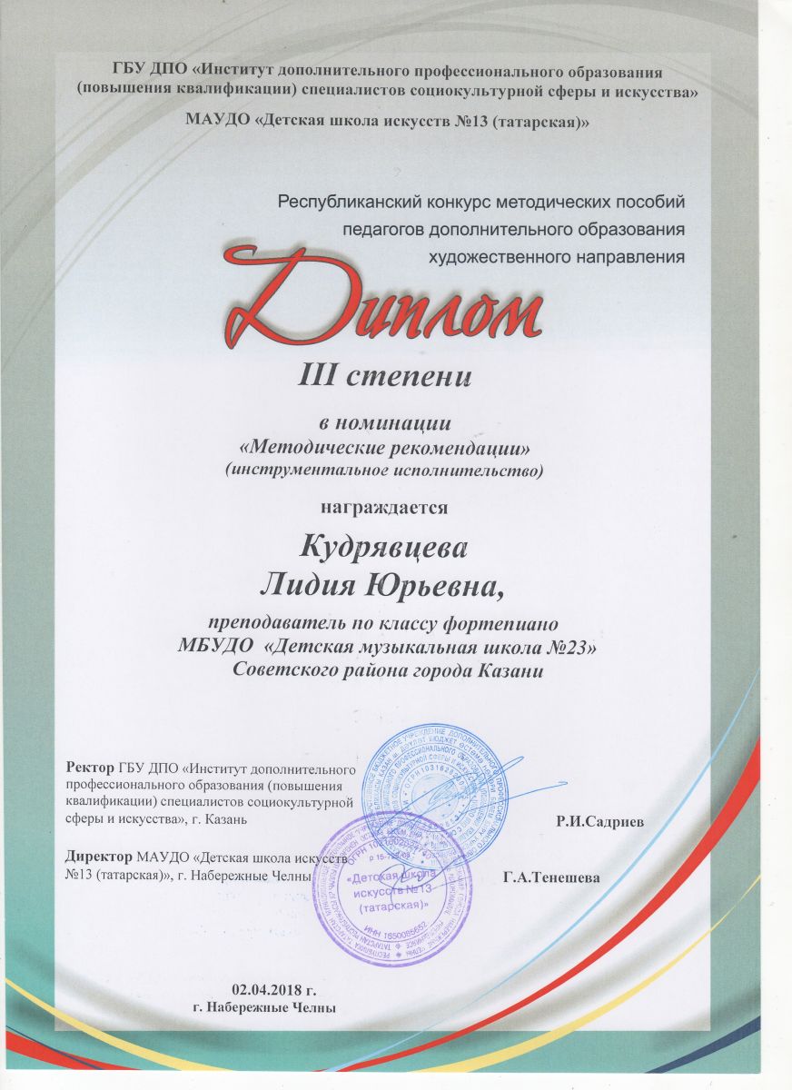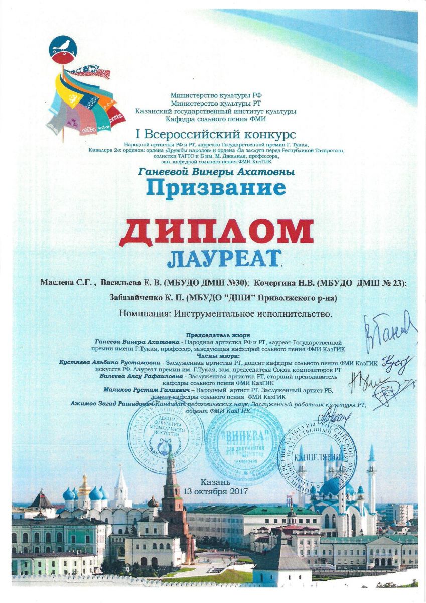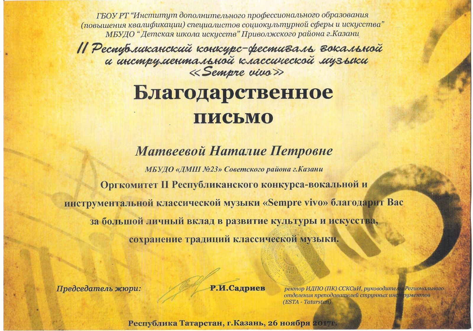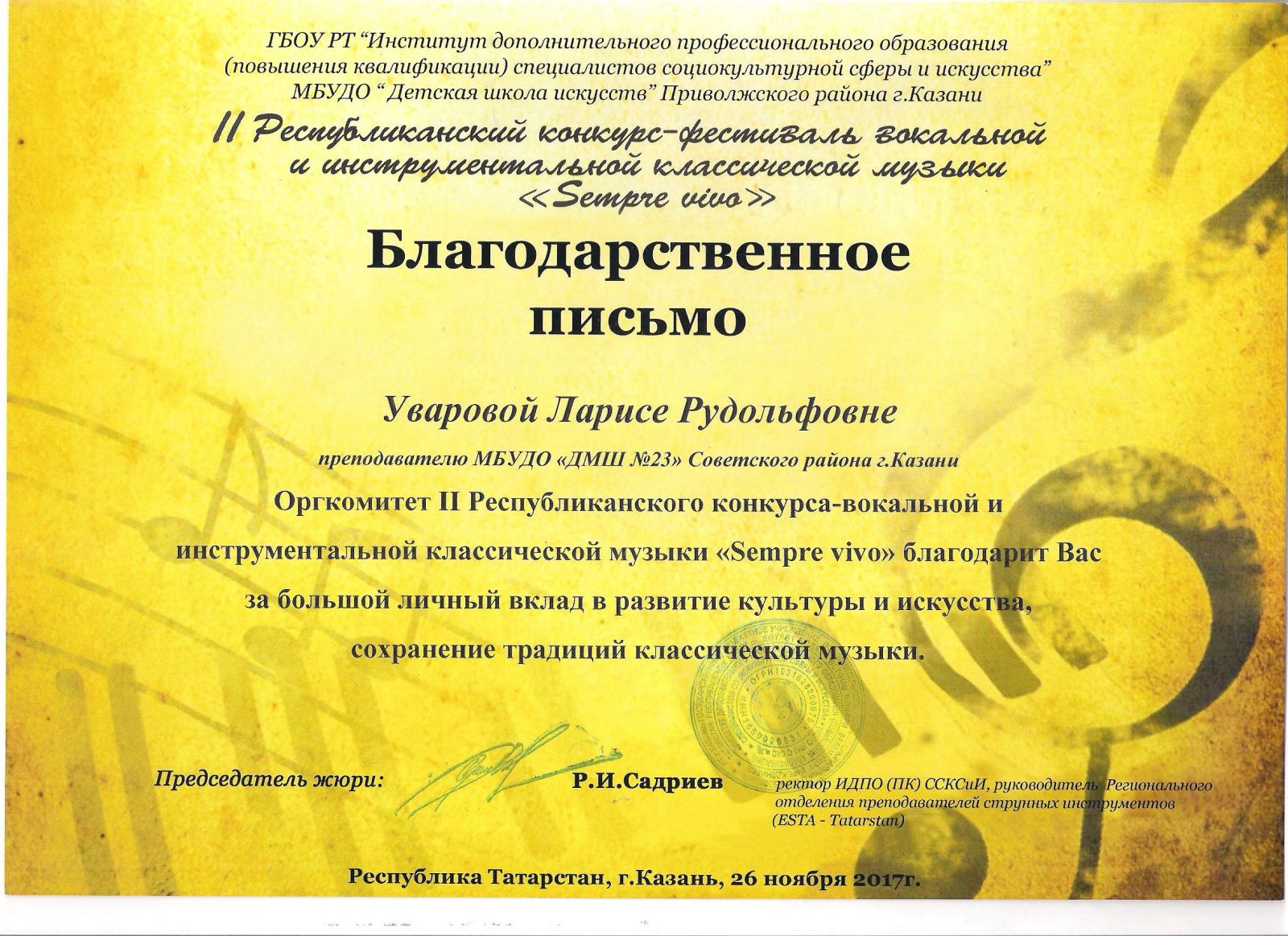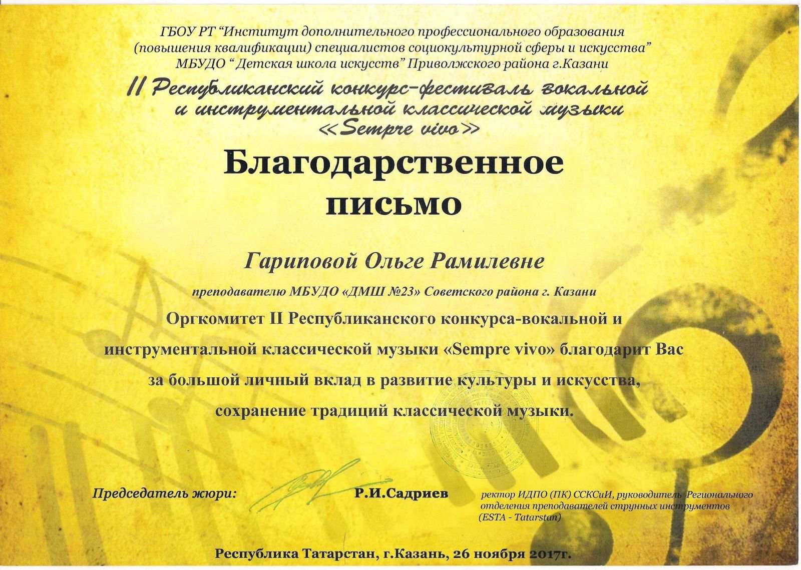 Республиканский конкурс юных композиторов Татарстана - Благодарность - Дутова Е.П.