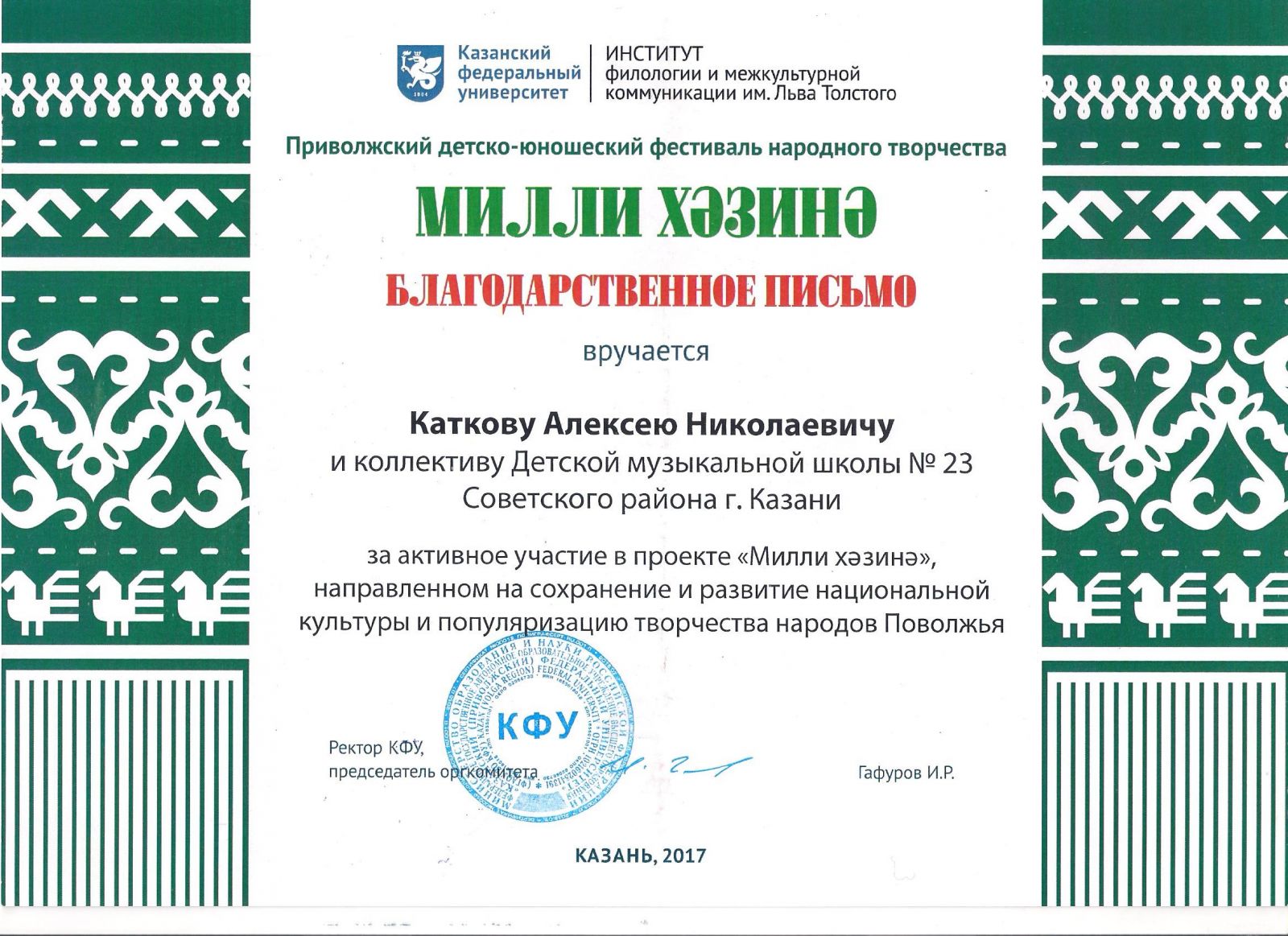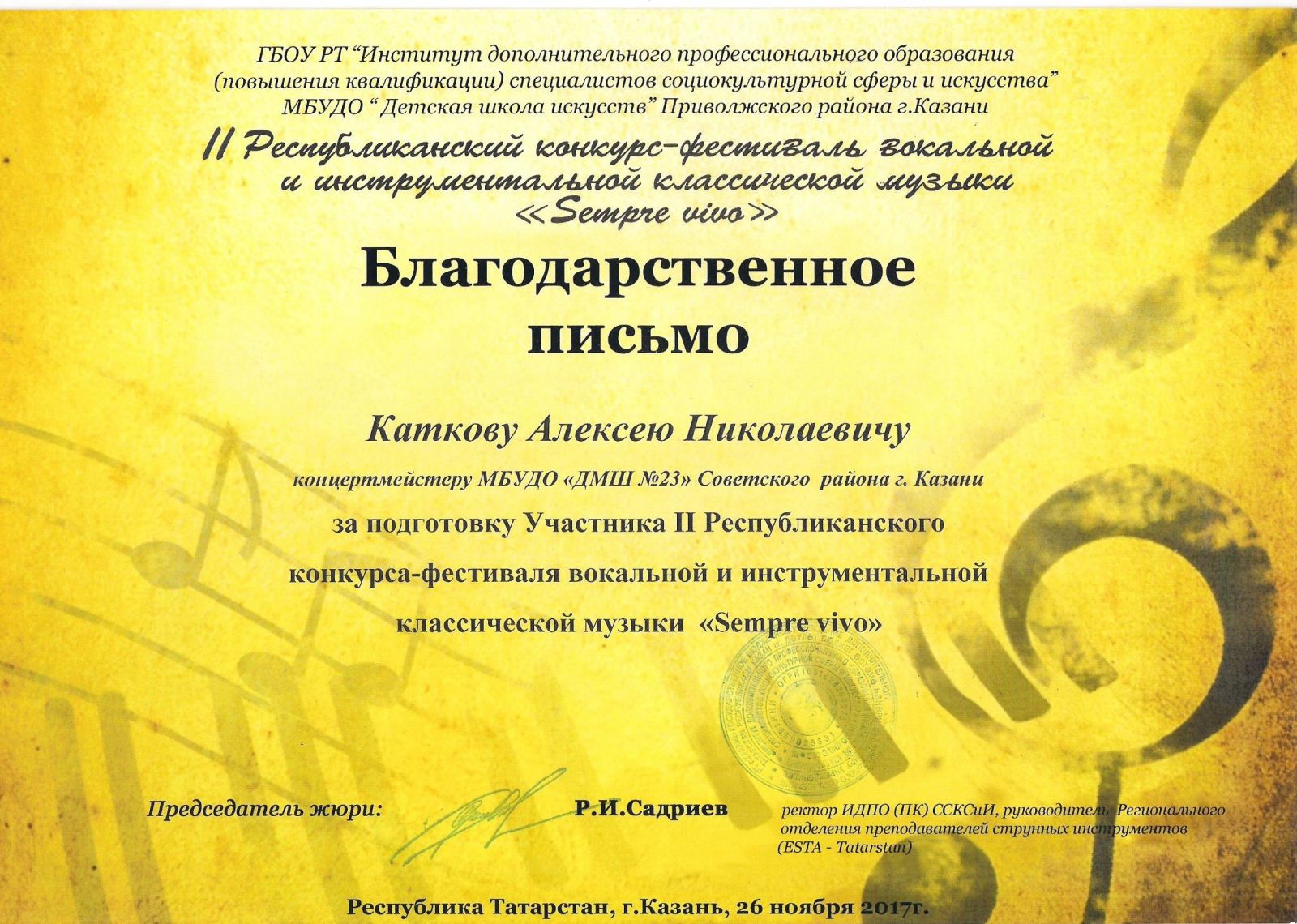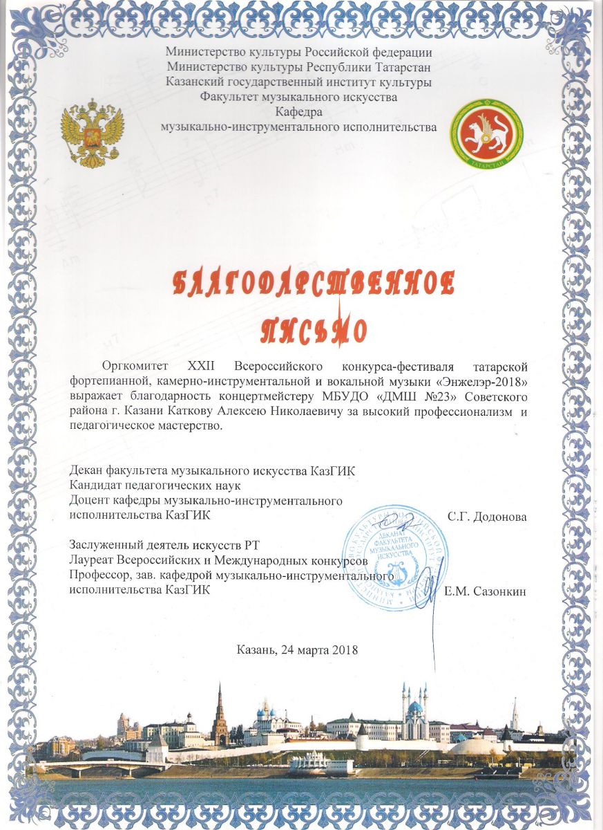 Почётная грамота Министерства образования и науки Республики Татарстан - Катков А.Н.
