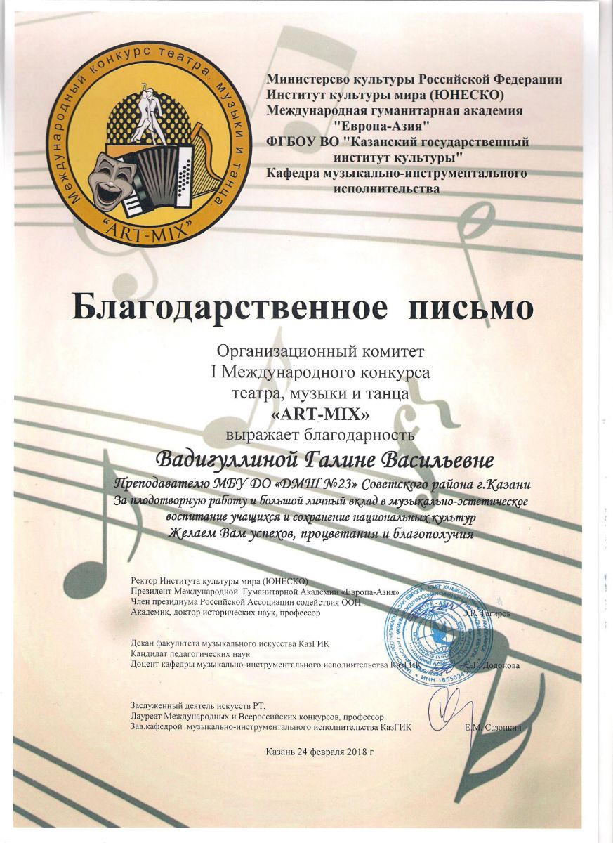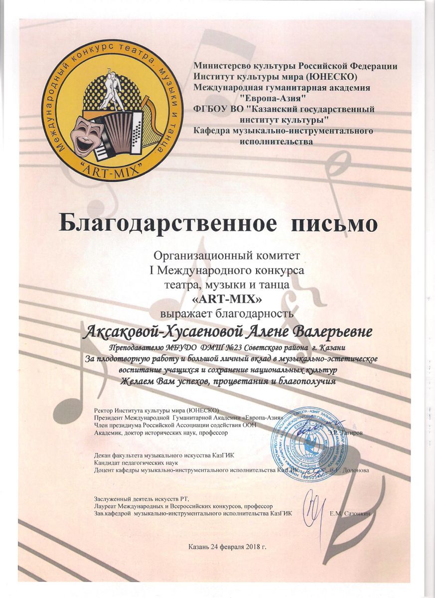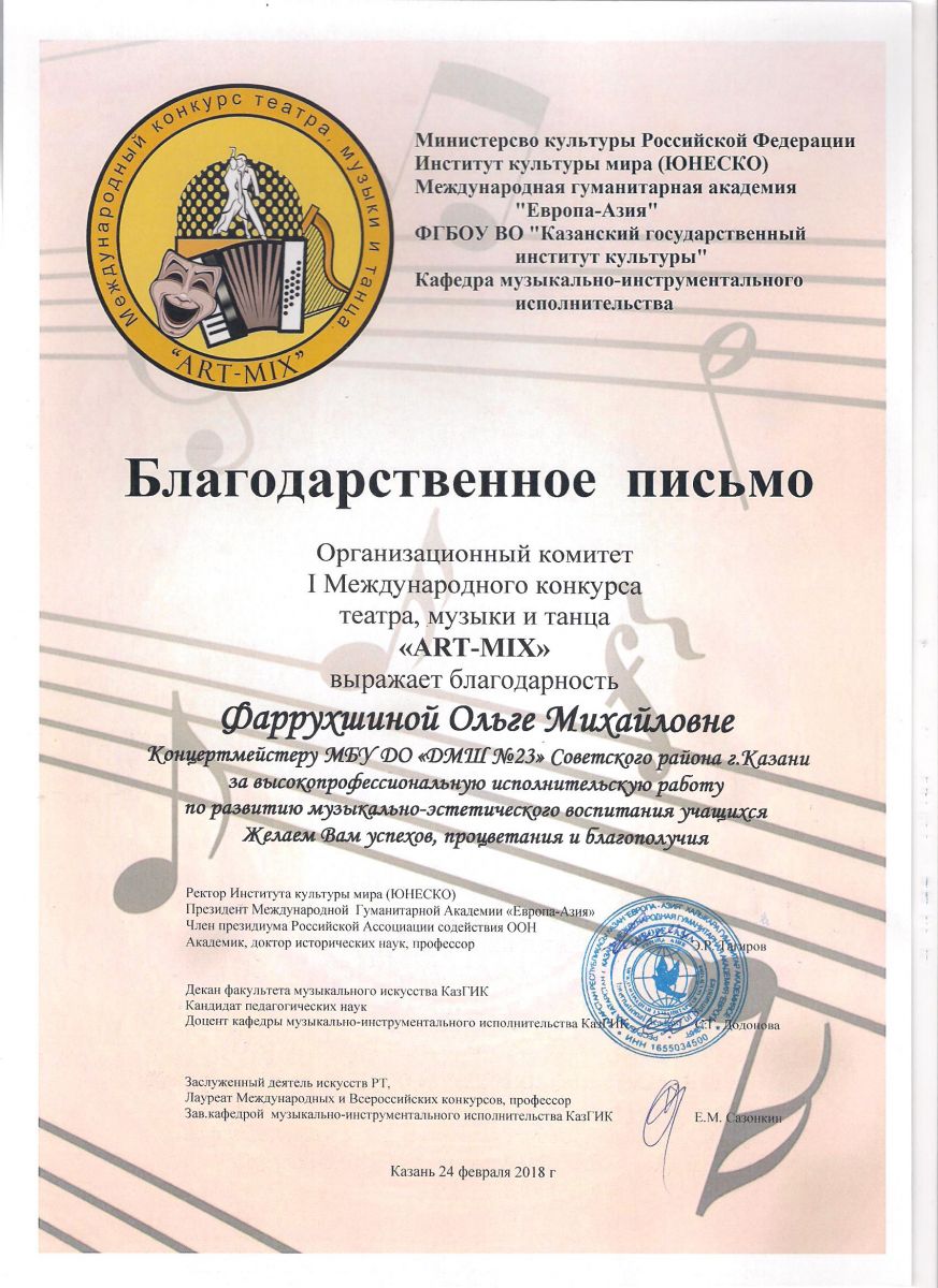 I Международный конкурс театра, музыки и танца "ART-MIX" - Благодарственное письмо - Фаррухшина О.М.