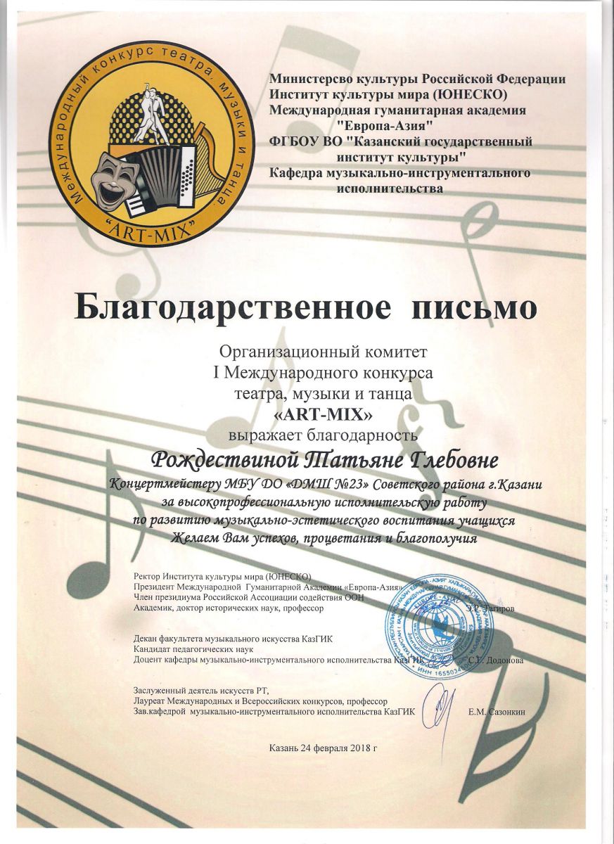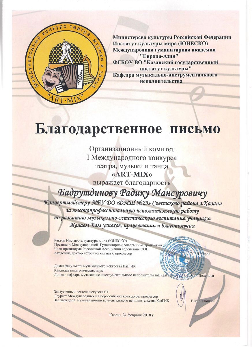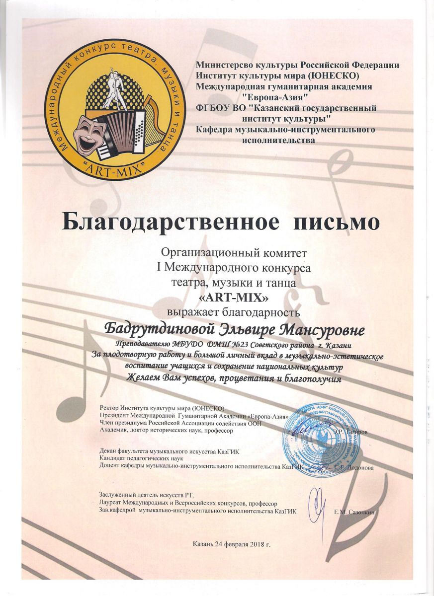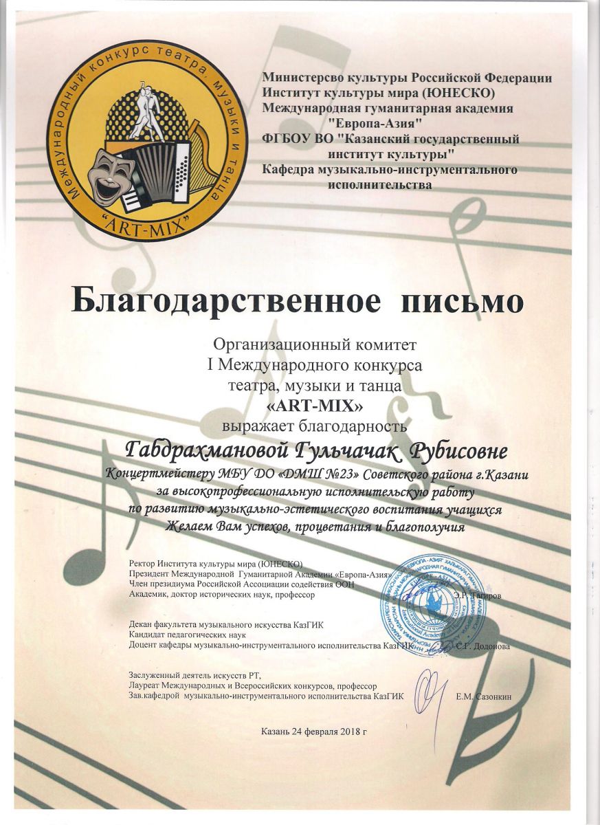 I Международный конкурс театра, музыки и танца "ART-MIX" - Благодарственное письмо - Фаррухшина О.М.