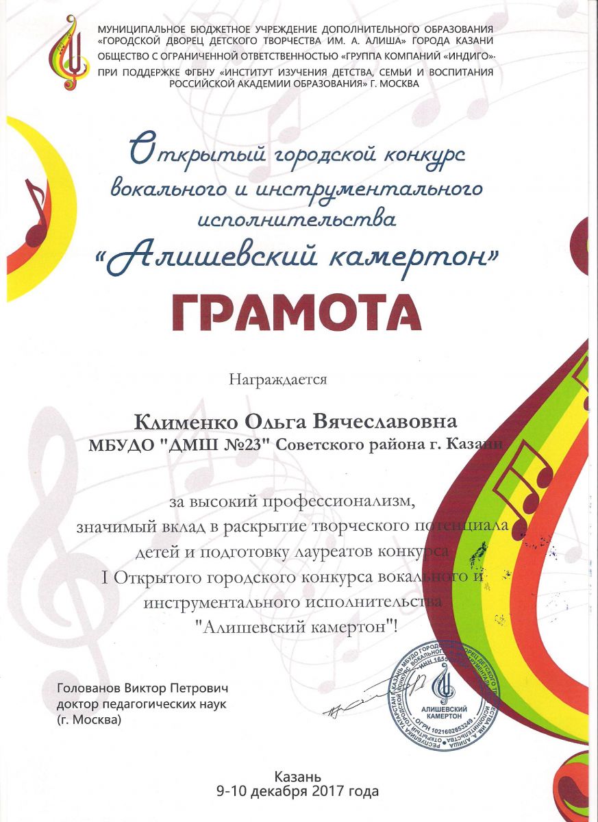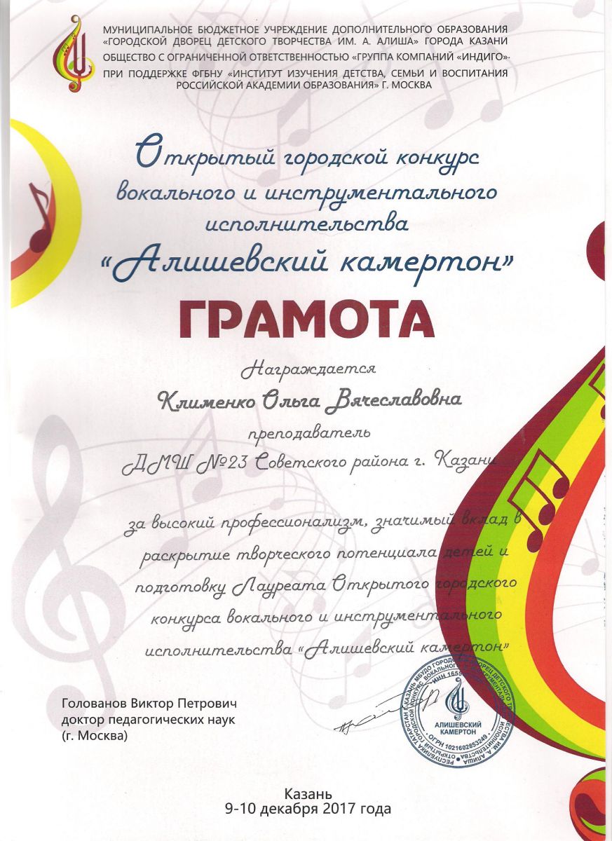 Открытый городской конкурс вокального и инструментального исполнительства "Алишевский камертон" - Грамота - Клименко О.В.