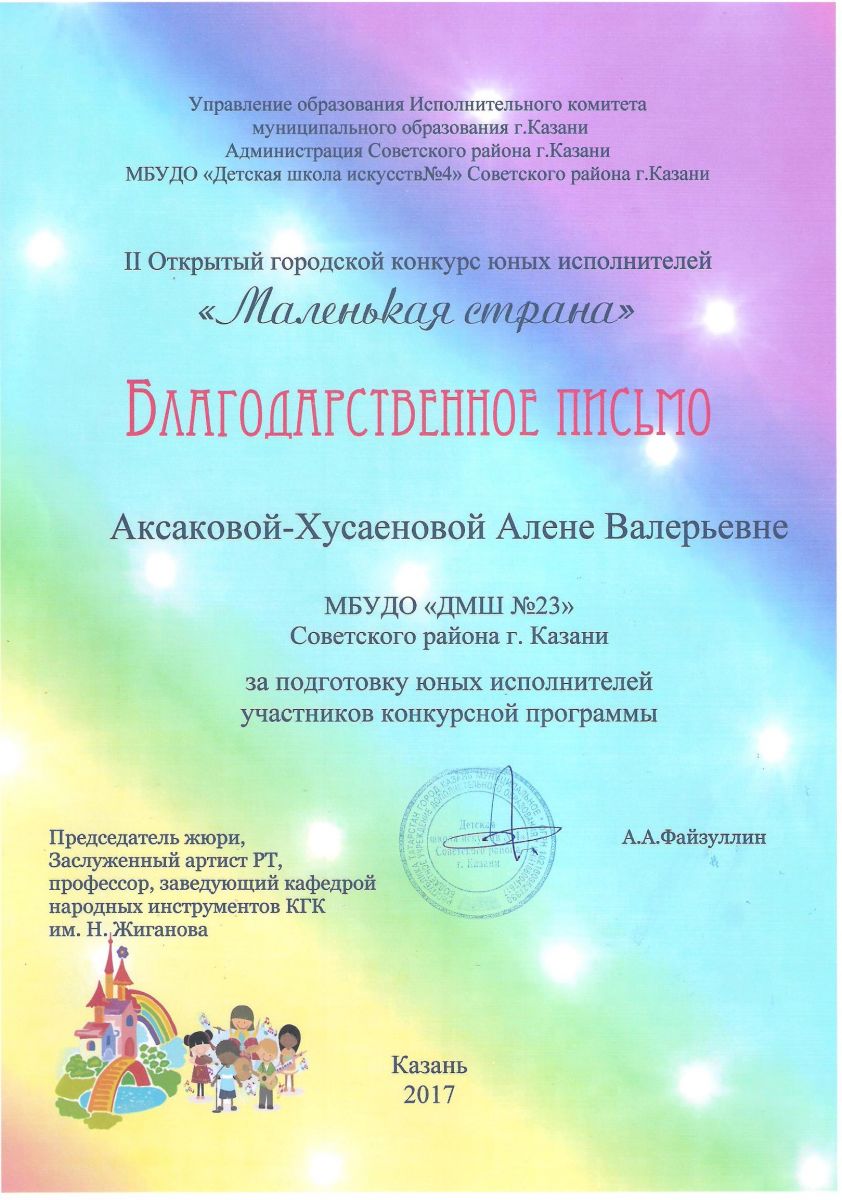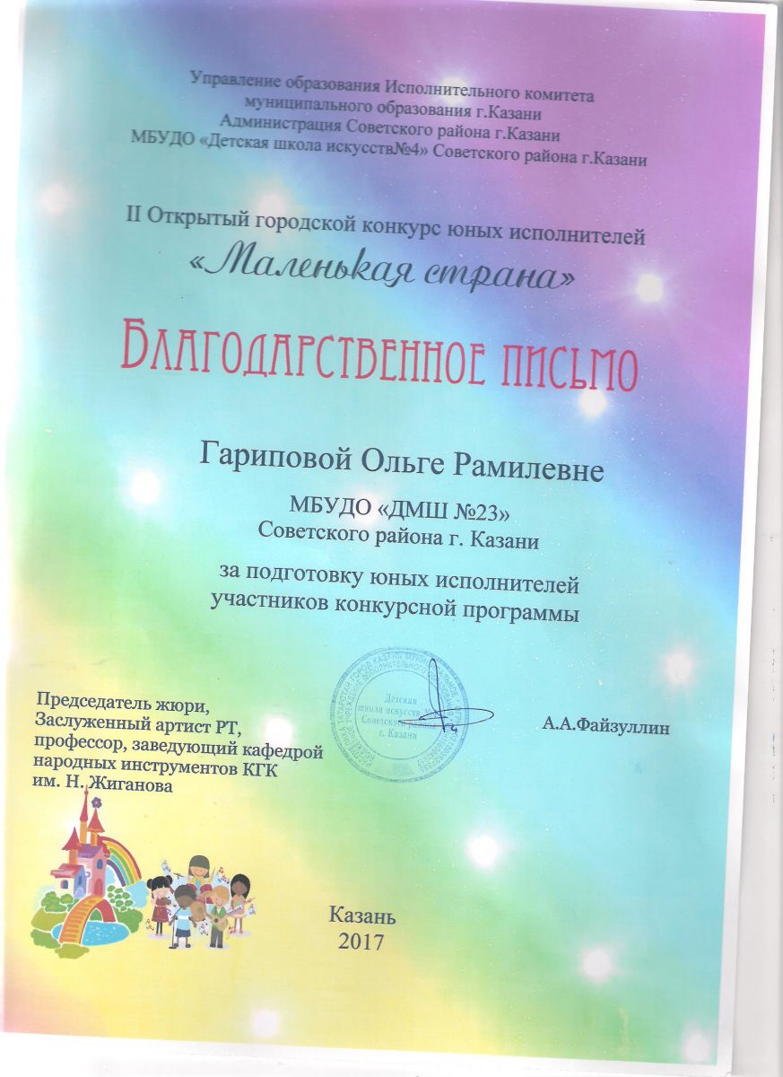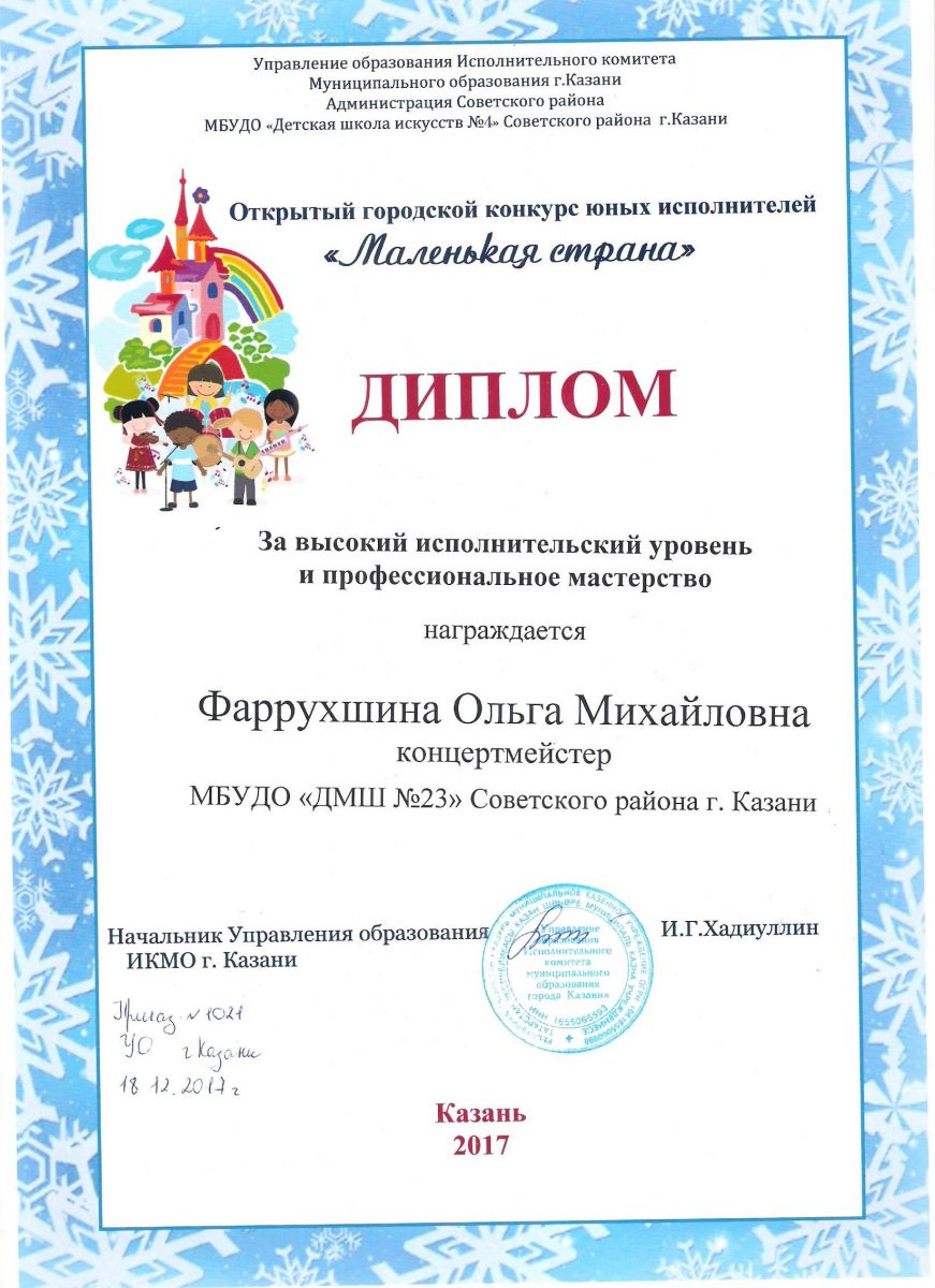 II Открытый городской конкурс юных исполнителей "Маленькая страна" - Диплом - Фаррухшина О.М.