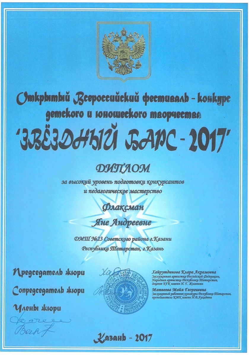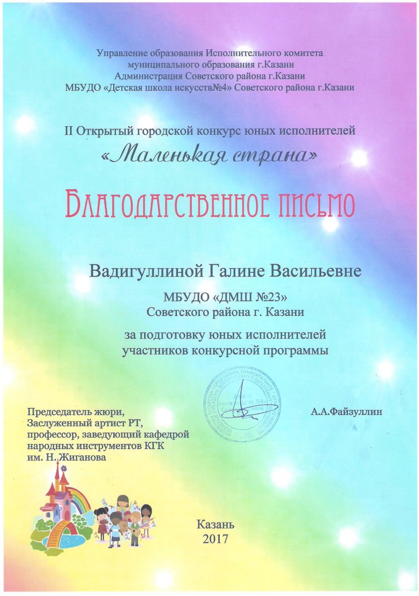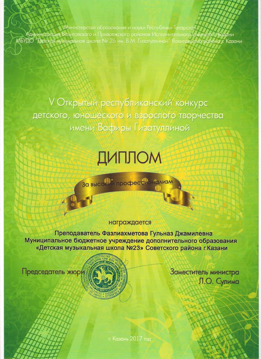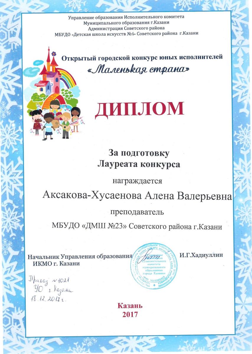 II Открытый городской конкурс юных исполнителей "Маленькая страна" - Диплом - Фаррухшина О.М.