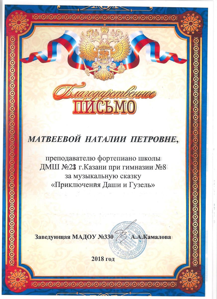Благодарственное письмо за музыкальную сказку от заведующей МАДОУ №330 - Матвеева Н.П.