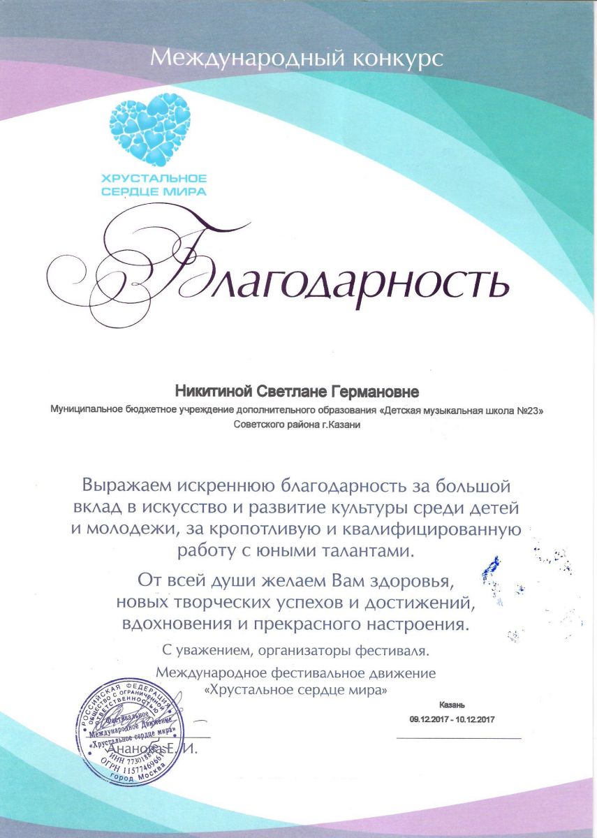 Международный конкурс "Хрустальное сердце мира" - Благодарность - Никитина С.Г.