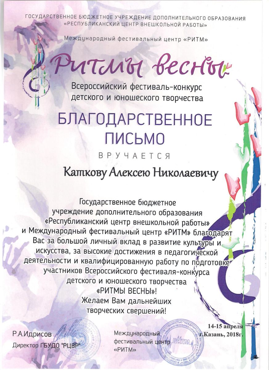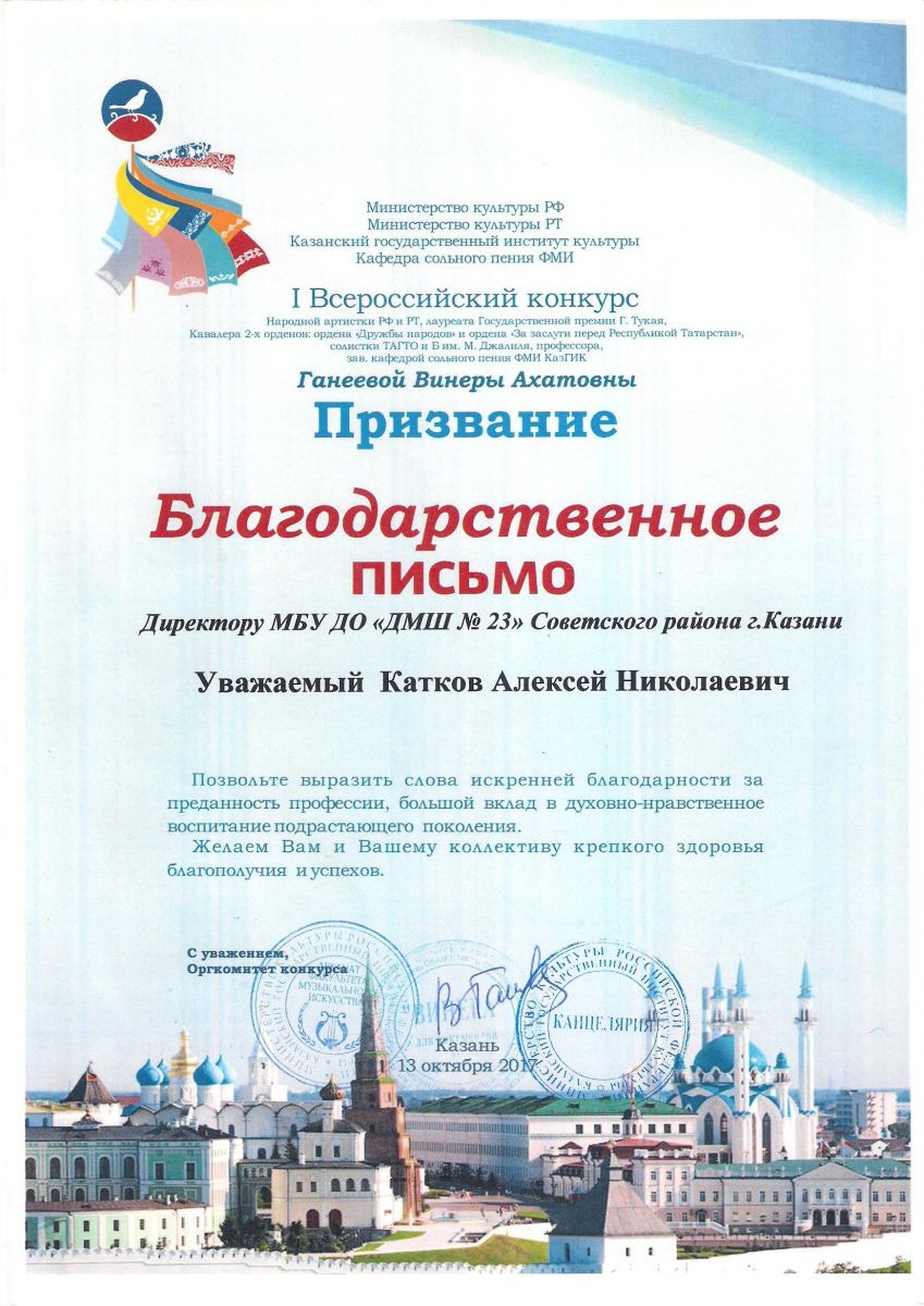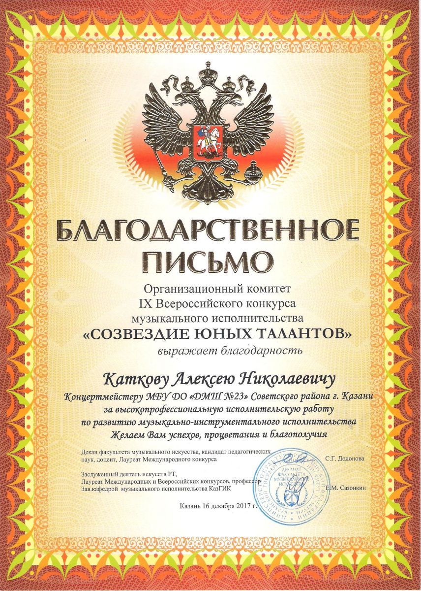 I Всероссийский конкурс "Призвание" - Благодарственное письмо - Катков А.Н.