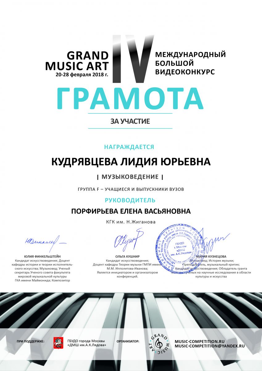 IV Международный большой видео конкурс "Grand music art" - Грамота за участие - Кудрявцева Л.Ю.