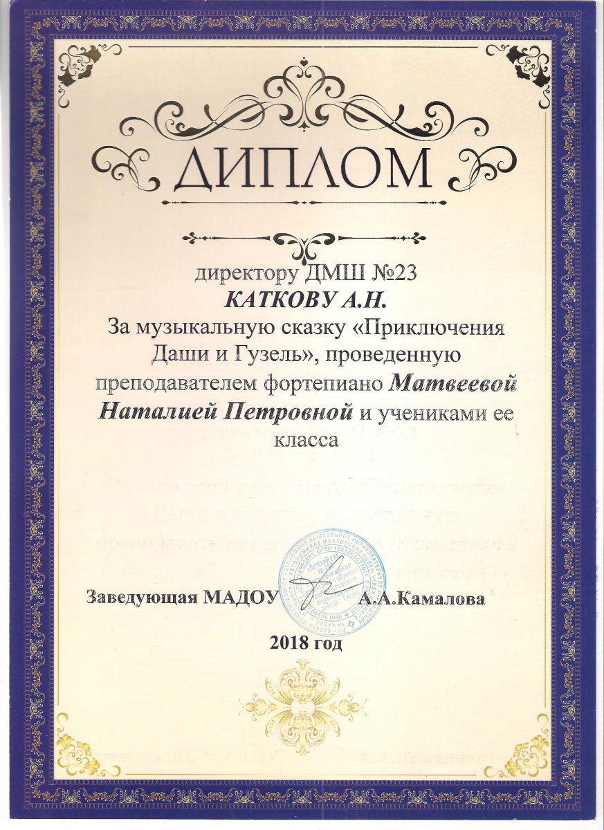Диплом за музыкальную сказку от заведующей МАДОУ №330 - Катков А.Н.