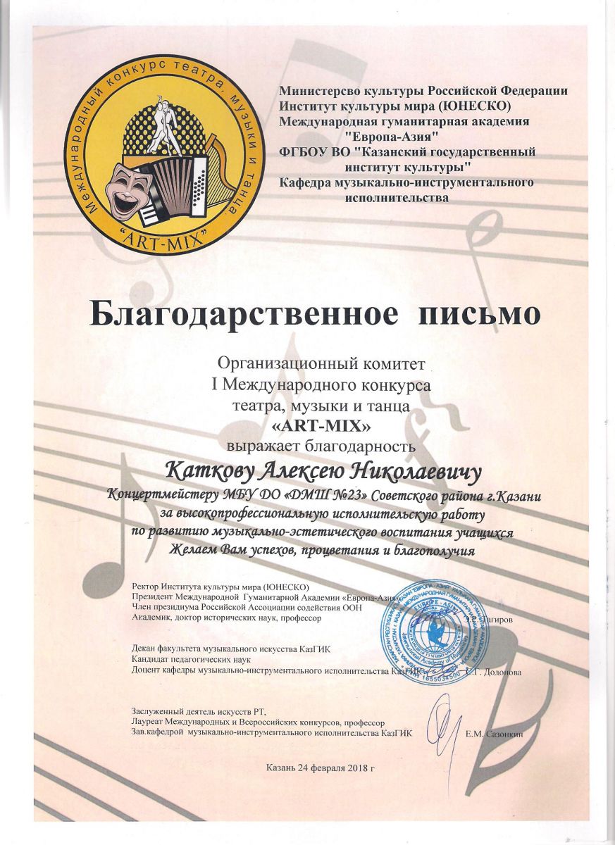 I Международный конкурс театра, музыки и танца "ART-MIX" - Благодарственное письмо - Катков А.Н.